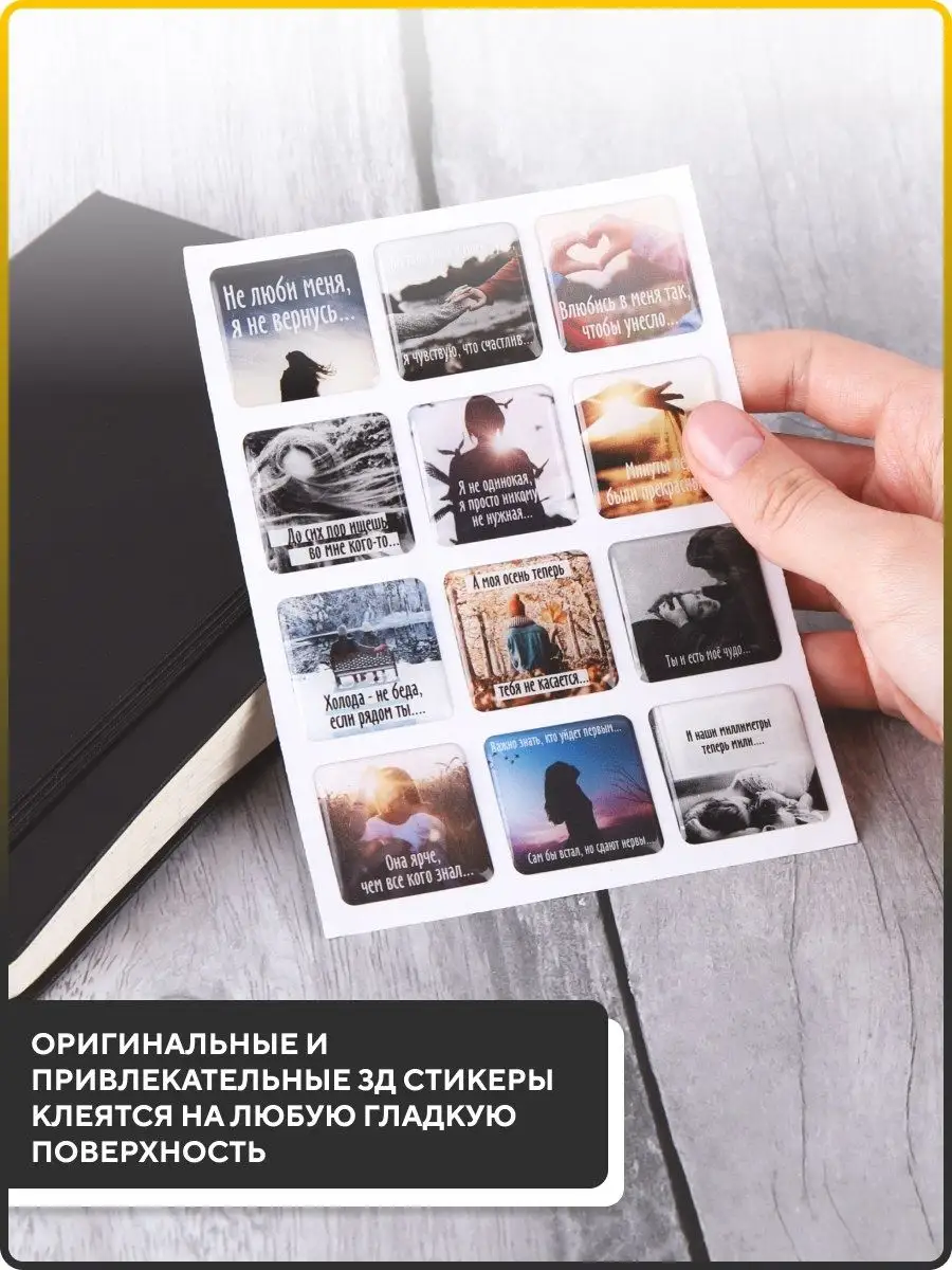 Оригинальные декоративные стикеры на телефон 3d украсят ваш телефон и ноутбук, а также прекрасно дополнят другие гладкие поверхности. Благодаря 3d наклейкам с изображениями сердец и романтики, ваш телефон будет выглядеть уникально и необыкновенно. Наклейки ручной работы высокого качества, надежно приклеиваются, не рвутся и не выцветают. Стикеры и наклейки на клейкой основе не оставляют следов. Объемные стикеры могут защитить камеру вашего телефона от соприкосновения с поверхностью, от царапин и сколов при падении. Набор многоразовых наклеек из эпоксидной смолы состоит из 12 стикеров, на которых изображены наклейки с цитатами. Эти яркие и необычные аксессуары для смартфона вызовут восторг мальчиков и девочек, подростков и взрослых людей. Многоразовые наклейки станут отличным украшением тетрадей и ежедневников. В нашем магазине вы можете найти наклейки аниме, цитаты, мияги (miyagi), их можно наклеить на холодильник, на iphone (айфон). Стикерами можно дополнить любой женский или мужской подарочный набор. Парные стикеры это прекрасный подарок девушке, парню, другу, подруге, сестре, брату. Оригинальные 3d стикеры наклейки на телефон станут отличным подарком парню, другу, дедушке, брату, папе, любимому, мужу, мужчине, сестре, подруге, девушке, жене, маме, то есть любому человеку, на годовщину свадьбы, на день рождения, на 23 февраля, на день всех влюбленных, на новый год, на 8 марта. Такой подарок оценит любимый мужчина, друг, брат, отец, жена, девушка, подруга, сестра. 3d наклейки на телефон Подарки оптом. Мы позаботились и том, чтобы ваш креативный подарок любимому или любимой был доставлен целым и невредимым. Каждый набор упакован в упаковочный пакеты с клеевым клапаном, для того чтобы на наклейки не попала влага.