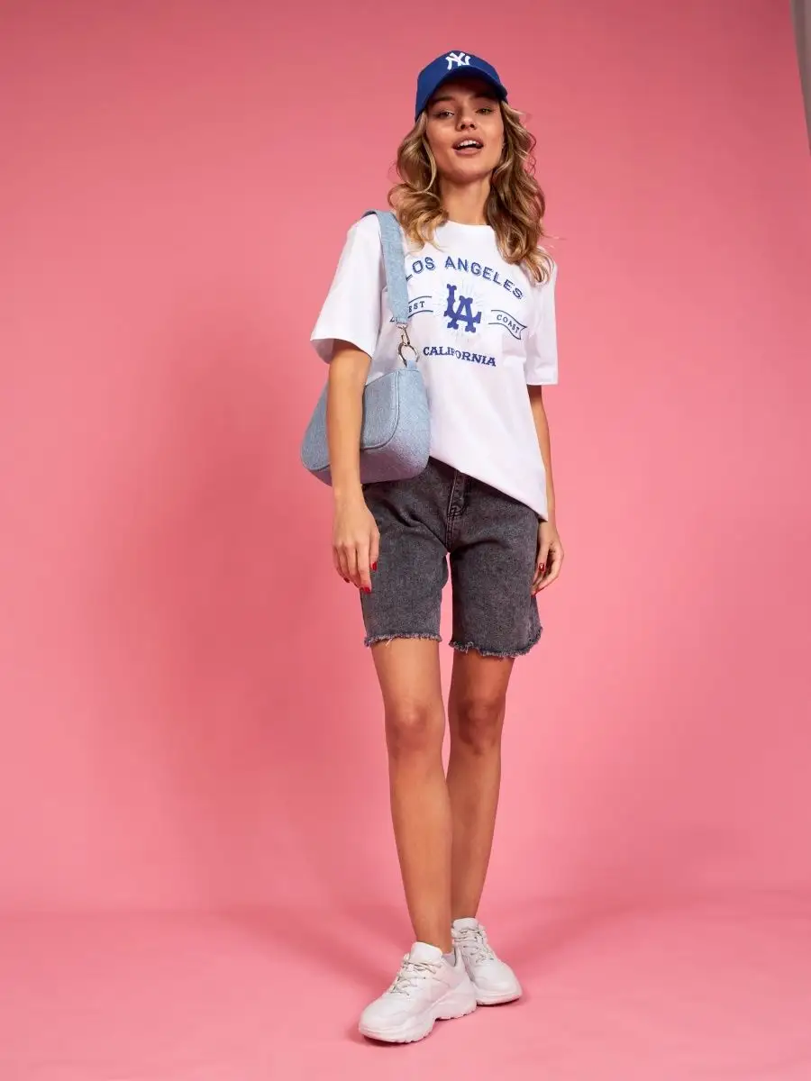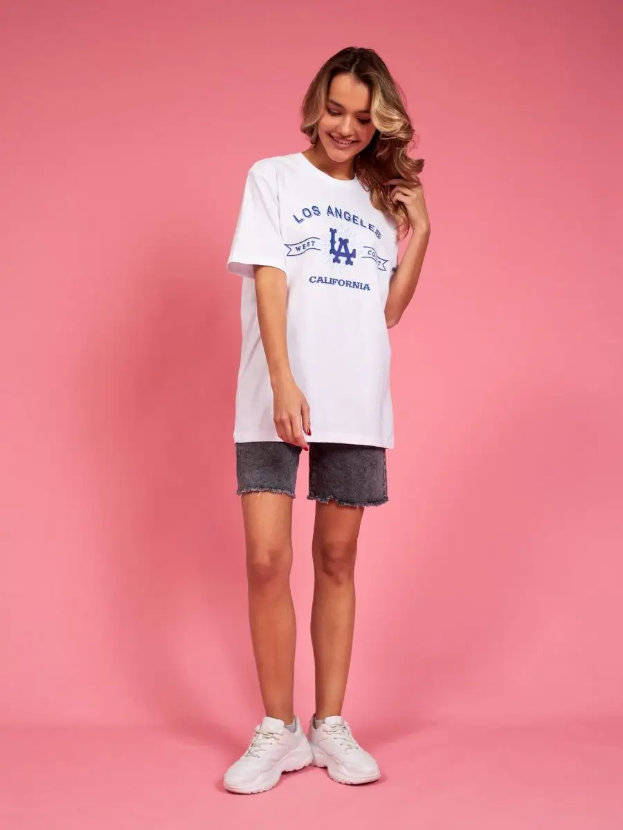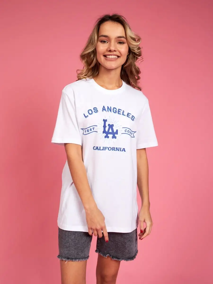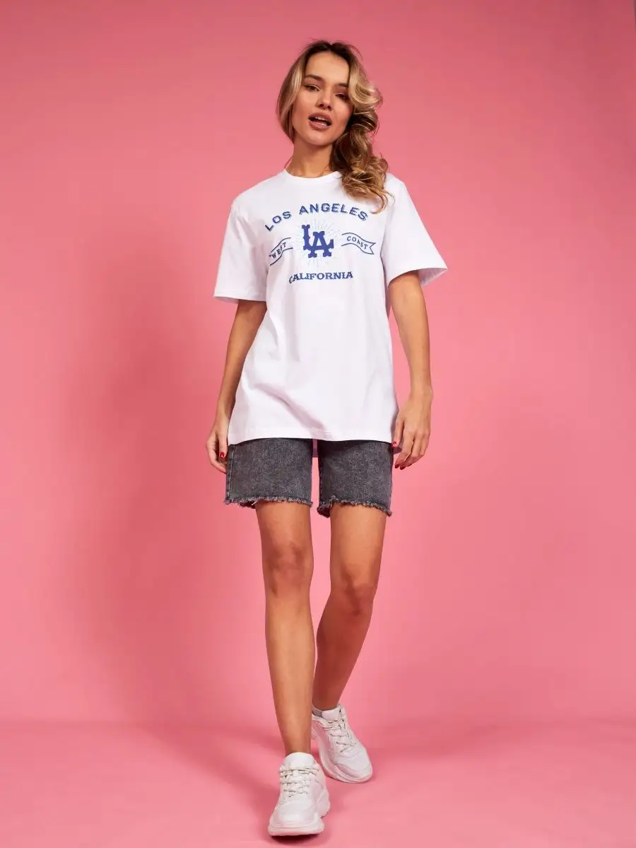 Мода в свободном стиле набирает обороты. В связи с этим наш бренд предлагает стильную футболку женскую оверсайз с принтом California ( Калифорния )футболка los angeles ( лос анджелес ). Молодежная одежда в стиле oversize имеет свободный крой. Базовая модная футболка с округлой горловиной, которая держит форму и со временем не растянется. Повседневная майка свободного кроя с удлиненным рукавом и со спущенным плечом. Cостав – хлопок средней плотности, актуален в любое время года. Ткань слегка тянется, хорошо пропускает воздух, подходит для повседневной носки. Футболка уместна для дома, спорта: фитнеса, гимнастики, йоги, бега, тренировок в зале и танцев, очень удобна для активного отдыха на природе, летом в качестве пляжной одежды для поездки на море, также можно сочетать с городским стилем. С помощью универсальной модели футболки oversize можно создать совершенно разные образы, скрыть недостатки фигуры и подчеркнуть достоинства. На контрасте объемной футболки вы будете выглядеть более стройной. Туника – платье подойдет подросткам, девочкам и девушкам любого роста: высоким и невысоким. Беременные и кормящие женщины могут носить как платье-футболку. Футболка единого размера, подойдет женщинам с размерами одежды от 42 до 56. Специально для вас действуют акции и распродажи, где можно купить наши товары со скидкой. Свободная футболка - уместный подарок на праздник девушке, сестре, дочери, подруге, маме, любимой.