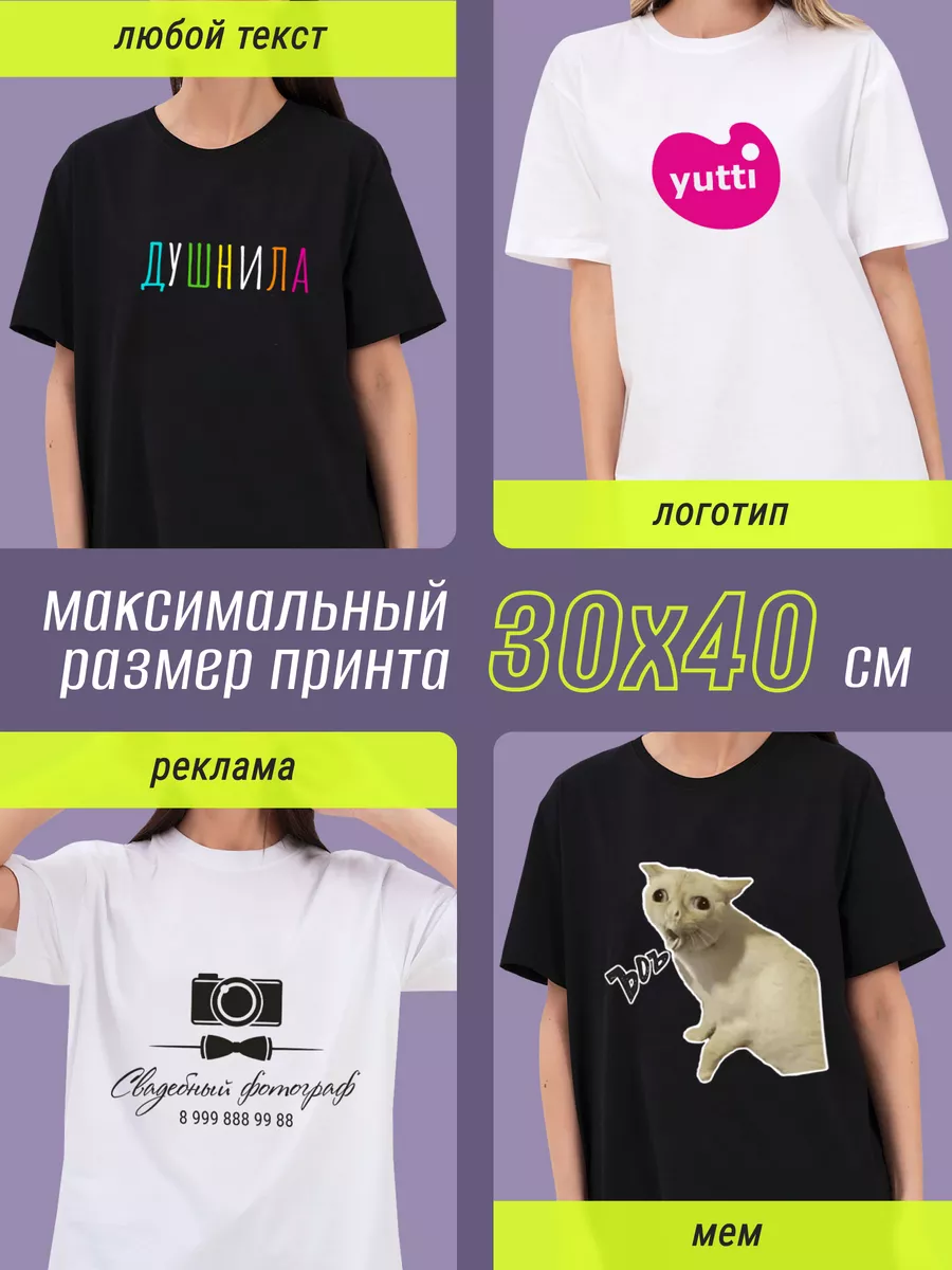 Просто напишите нам, и мы нанесем на футболку из 100% хлопка любую надписью или Вашу любимую фотографию!
