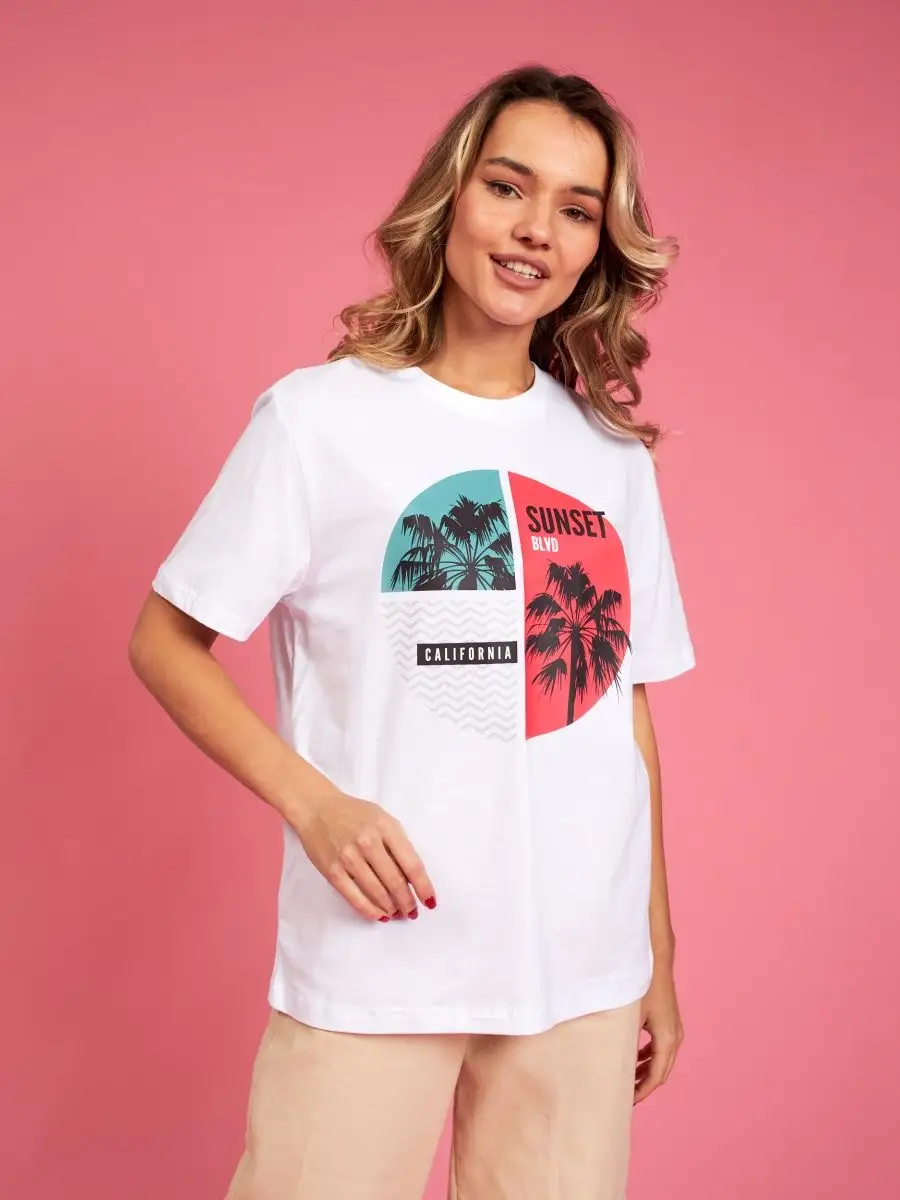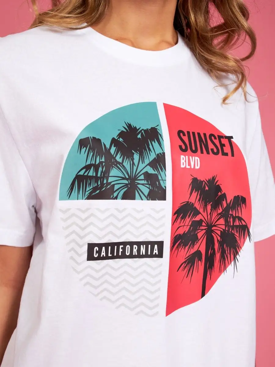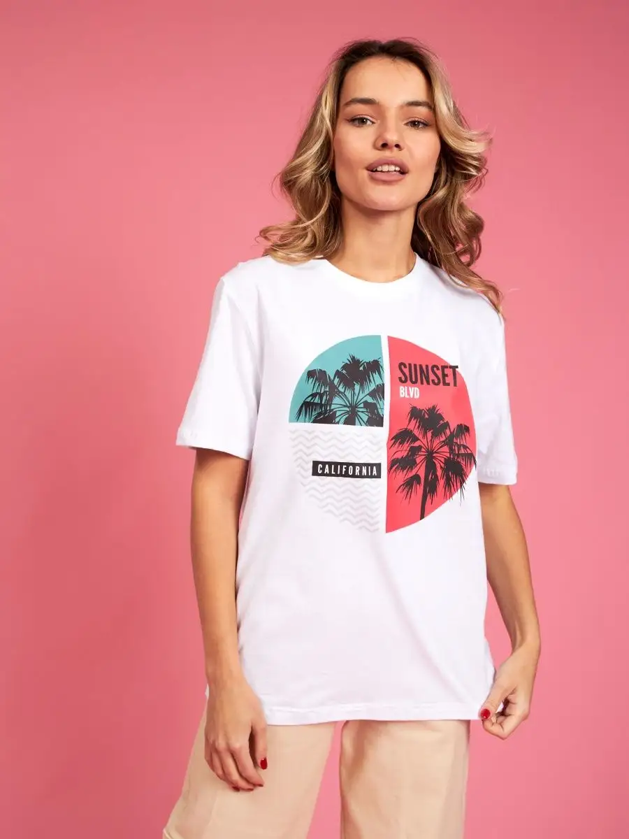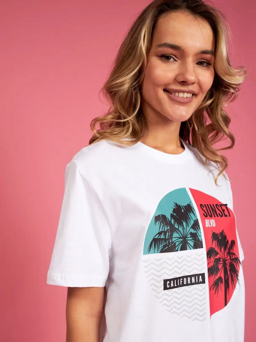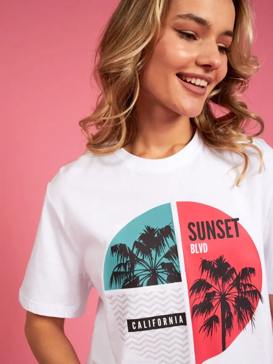 Мода в свободном стиле набирает обороты. В связи с этим наш бренд предлагает стильную футболку женскую оверсайз с принтом California ( Калифорния )футболка los angeles ( лос анджелес ). Молодежная одежда в стиле oversize имеет свободный крой. Базовая модная футболка с округлой горловиной, которая держит форму и со временем не растянется. Повседневная майка свободного кроя с удлиненным рукавом и со спущенным плечом. Cостав – хлопок средней плотности, актуален в любое время года. Ткань слегка тянется, хорошо пропускает воздух, подходит для повседневной носки. Футболка уместна для дома, спорта: фитнеса, гимнастики, йоги, бега, тренировок в зале и танцев, очень удобна для активного отдыха на природе, летом в качестве пляжной одежды для поездки на море, также можно сочетать с городским стилем. С помощью универсальной модели футболки oversize можно создать совершенно разные образы, скрыть недостатки фигуры и подчеркнуть достоинства. На контрасте объемной футболки вы будете выглядеть более стройной. Туника – платье подойдет подросткам, девочкам и девушкам любого роста: высоким и невысоким. Беременные и кормящие женщины могут носить как платье-футболку. Футболка единого размера, подойдет женщинам с размерами одежды от 42 до 56. Специально для вас действуют акции и распродажи, где можно купить наши товары со скидкой. Свободная футболка - уместный подарок на праздник девушке, сестре, дочери, подруге, маме, любимой.