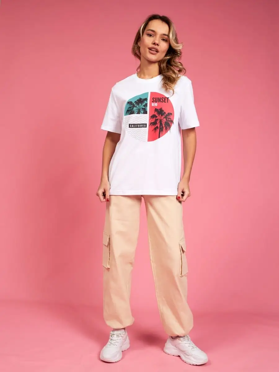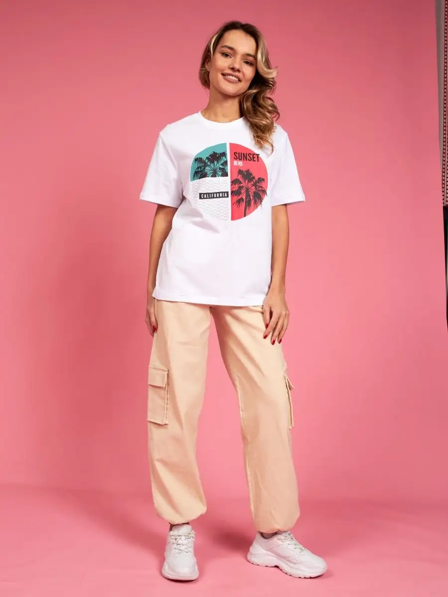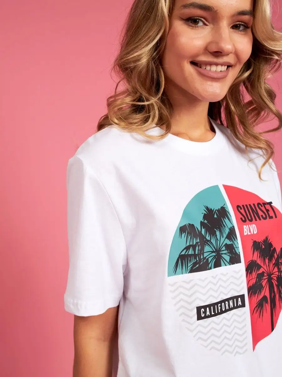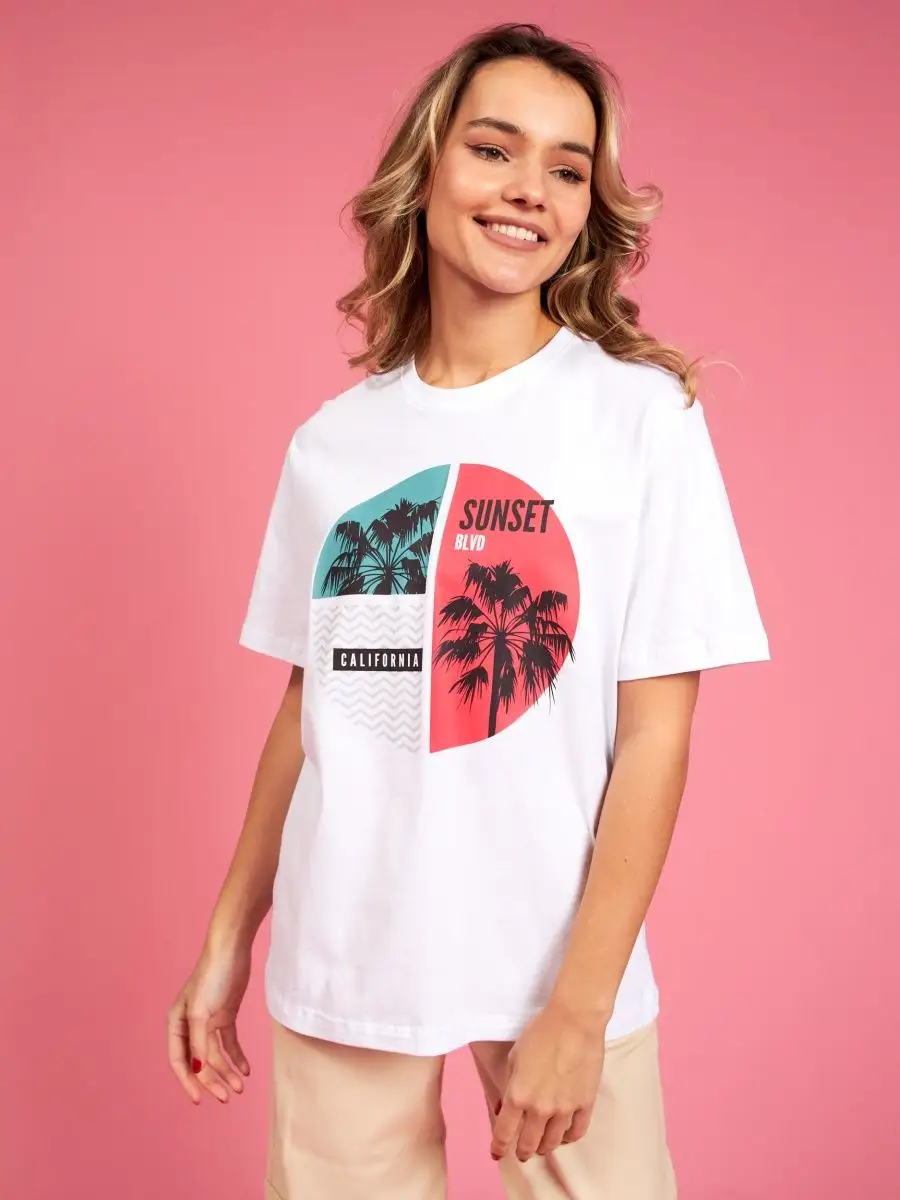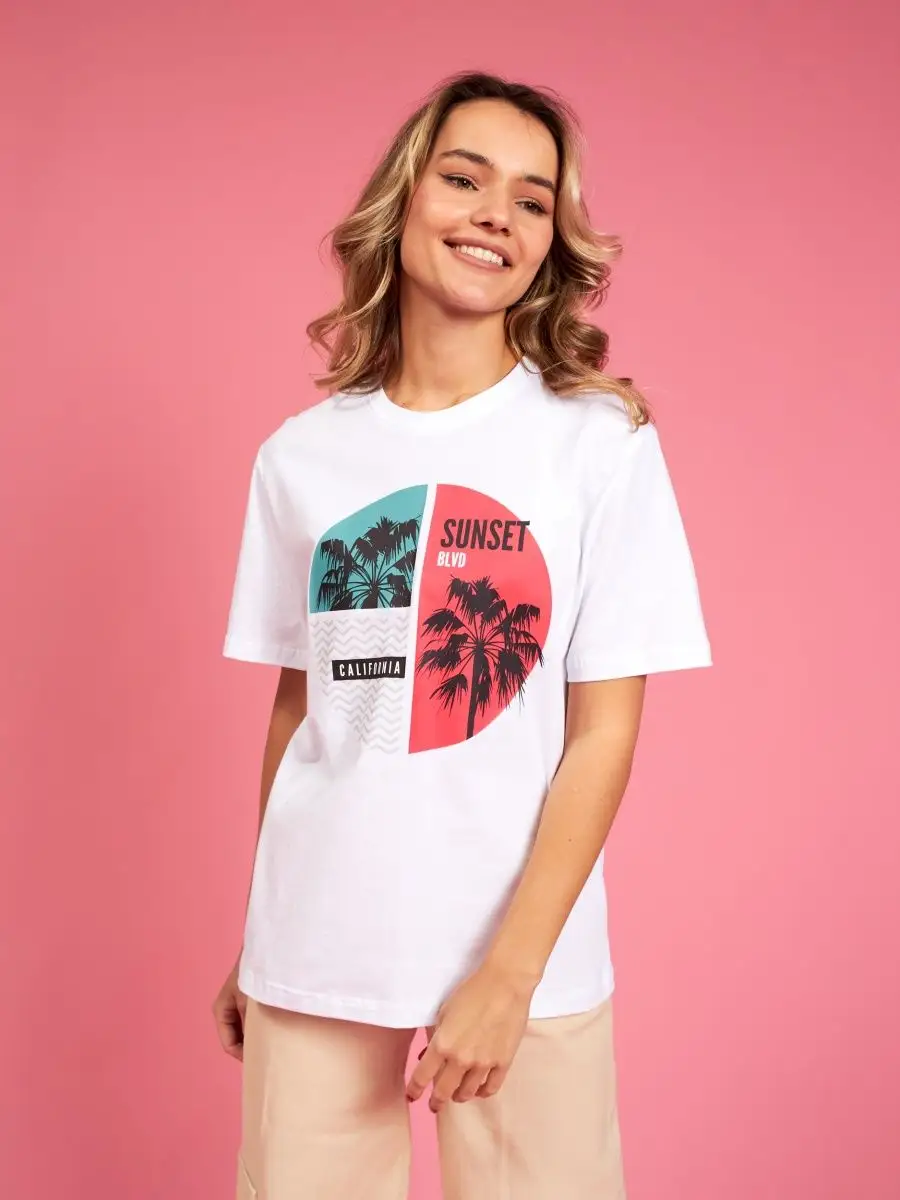 Мода в свободном стиле набирает обороты. В связи с этим наш бренд предлагает стильную футболку женскую оверсайз с принтом California ( Калифорния )футболка los angeles ( лос анджелес ). Молодежная одежда в стиле oversize имеет свободный крой. Базовая модная футболка с округлой горловиной, которая держит форму и со временем не растянется. Повседневная майка свободного кроя с удлиненным рукавом и со спущенным плечом. Cостав – хлопок средней плотности, актуален в любое время года. Ткань слегка тянется, хорошо пропускает воздух, подходит для повседневной носки. Футболка уместна для дома, спорта: фитнеса, гимнастики, йоги, бега, тренировок в зале и танцев, очень удобна для активного отдыха на природе, летом в качестве пляжной одежды для поездки на море, также можно сочетать с городским стилем. С помощью универсальной модели футболки oversize можно создать совершенно разные образы, скрыть недостатки фигуры и подчеркнуть достоинства. На контрасте объемной футболки вы будете выглядеть более стройной. Туника – платье подойдет подросткам, девочкам и девушкам любого роста: высоким и невысоким. Беременные и кормящие женщины могут носить как платье-футболку. Футболка единого размера, подойдет женщинам с размерами одежды от 42 до 56. Специально для вас действуют акции и распродажи, где можно купить наши товары со скидкой. Свободная футболка - уместный подарок на праздник девушке, сестре, дочери, подруге, маме, любимой.