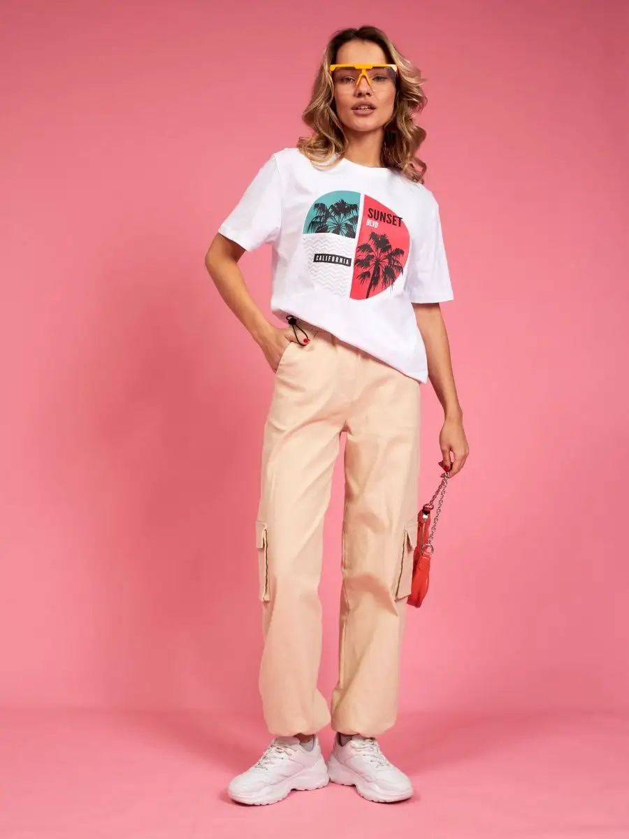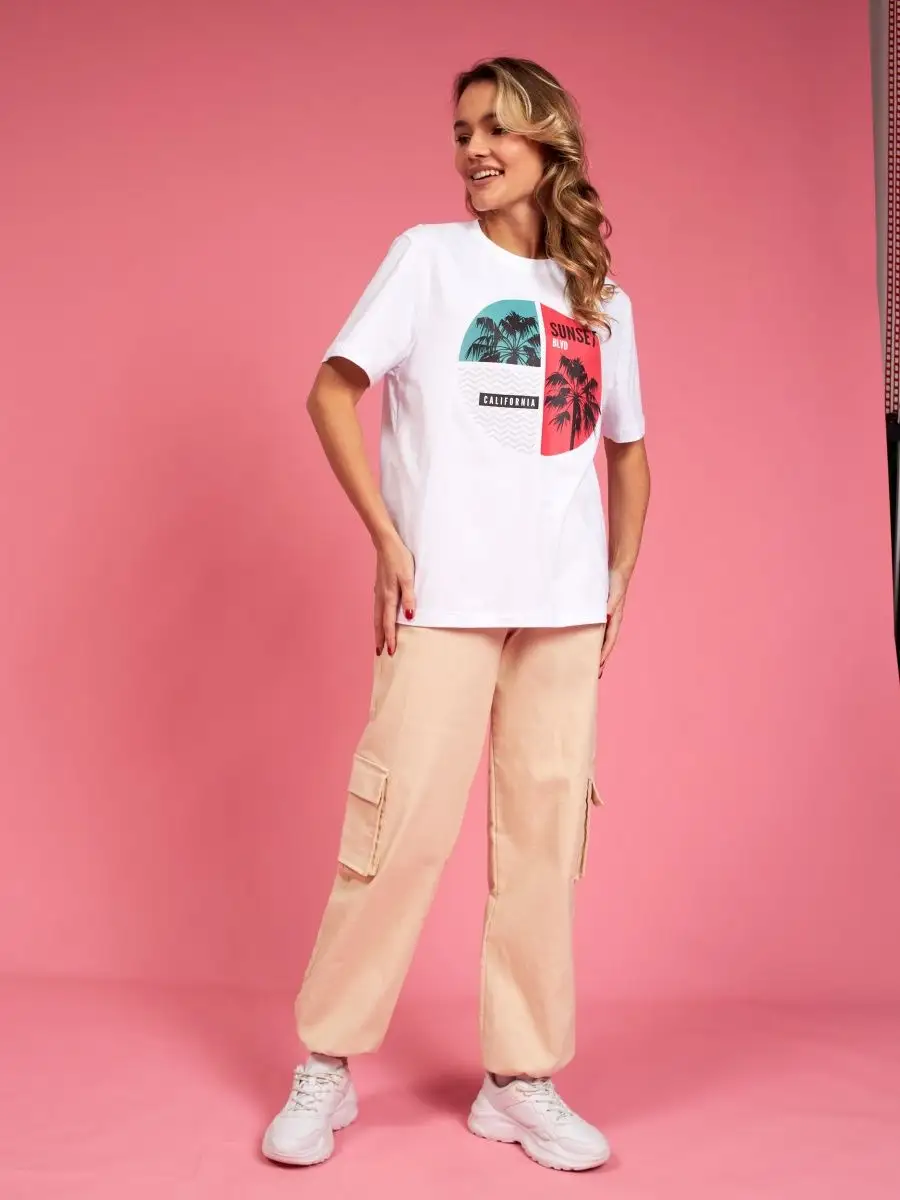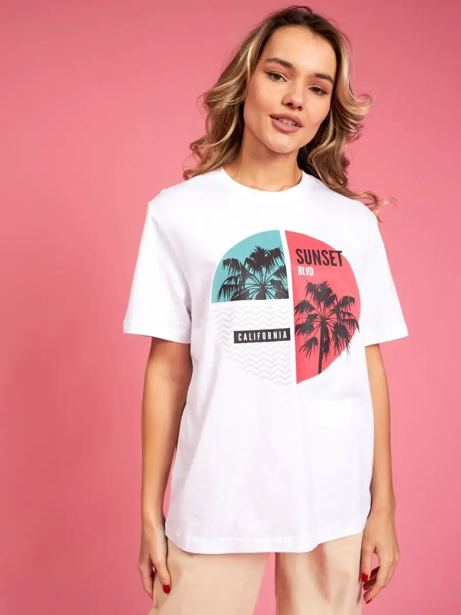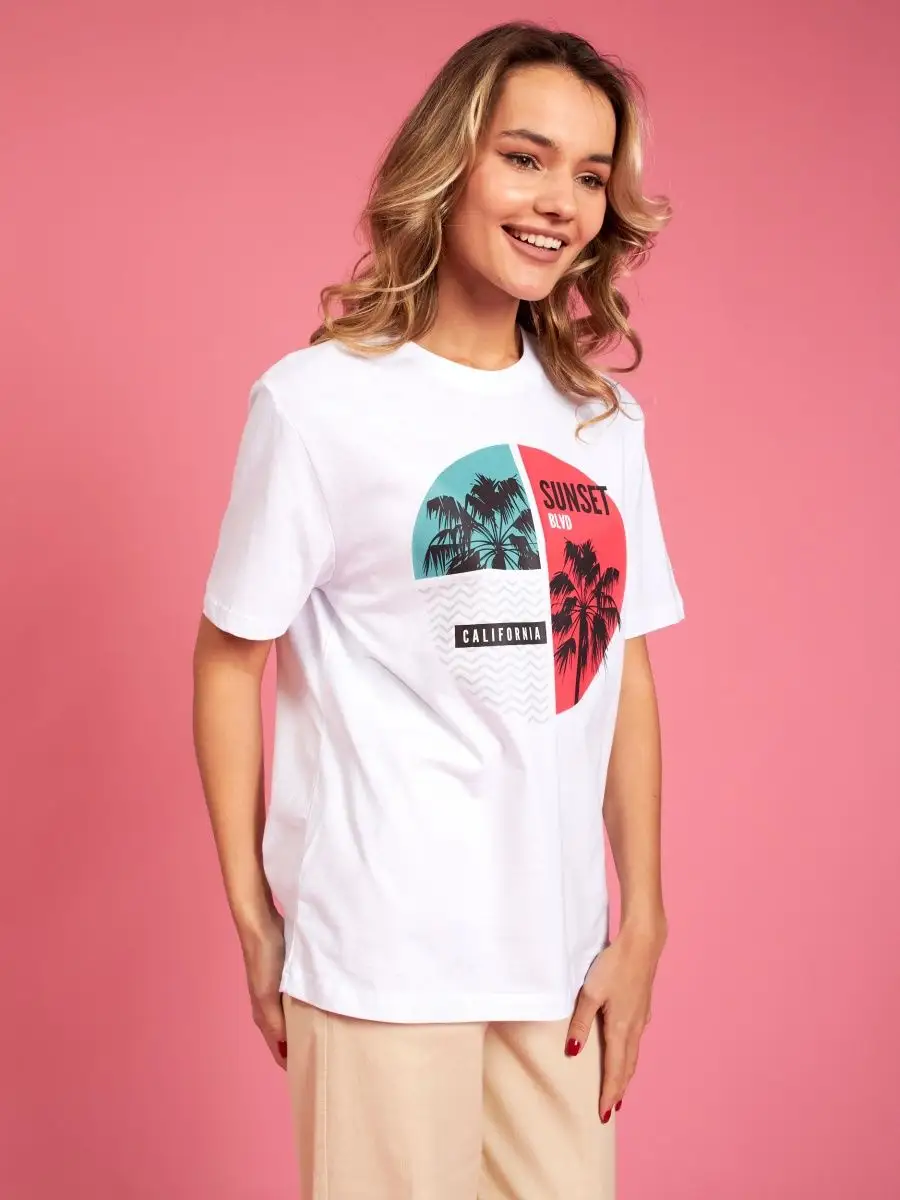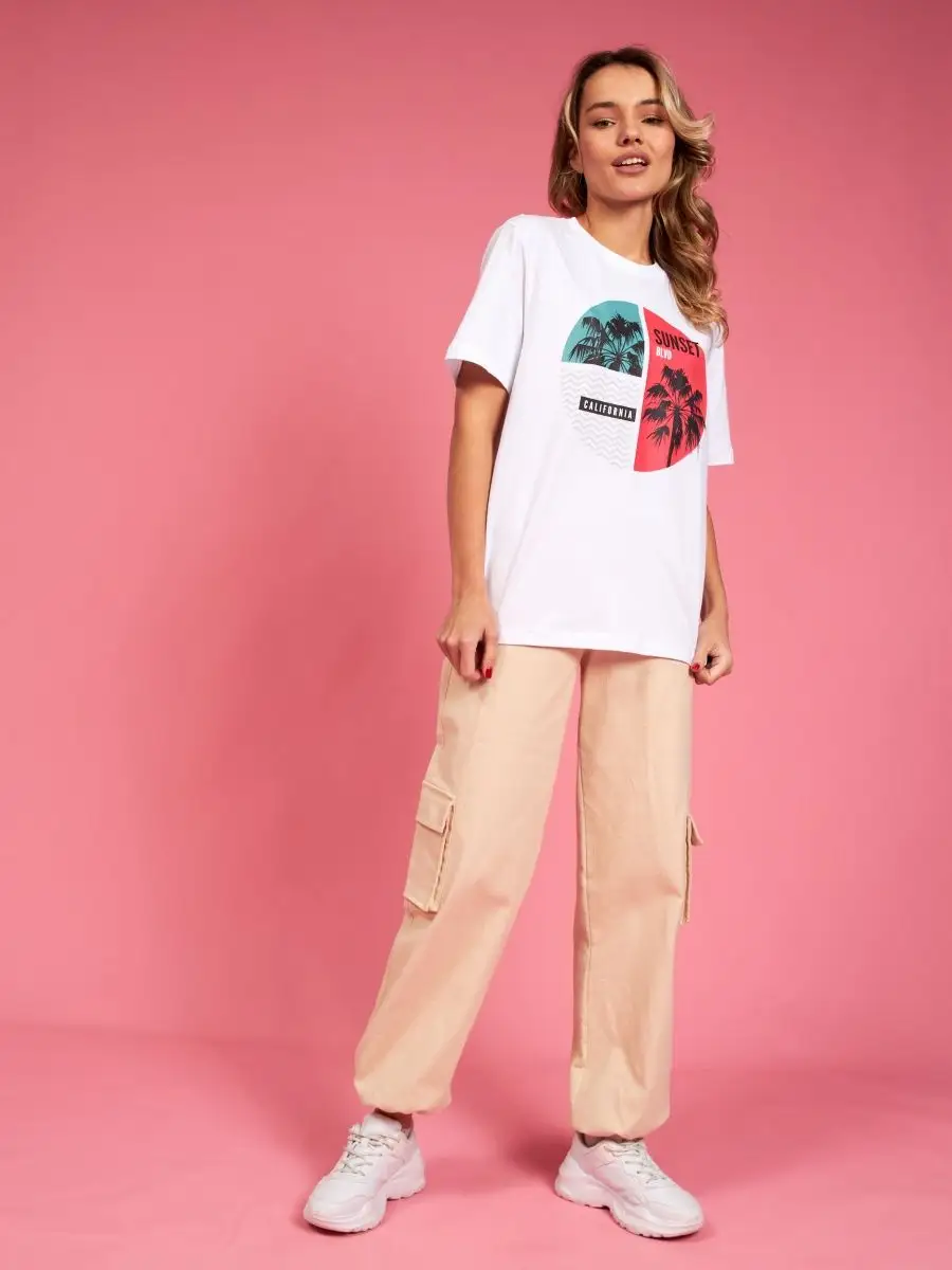 Мода в свободном стиле набирает обороты. В связи с этим наш бренд предлагает стильную футболку женскую оверсайз с принтом California ( Калифорния )футболка los angeles ( лос анджелес ). Молодежная одежда в стиле oversize имеет свободный крой. Базовая модная футболка с округлой горловиной, которая держит форму и со временем не растянется. Повседневная майка свободного кроя с удлиненным рукавом и со спущенным плечом. Cостав – хлопок средней плотности, актуален в любое время года. Ткань слегка тянется, хорошо пропускает воздух, подходит для повседневной носки. Футболка уместна для дома, спорта: фитнеса, гимнастики, йоги, бега, тренировок в зале и танцев, очень удобна для активного отдыха на природе, летом в качестве пляжной одежды для поездки на море, также можно сочетать с городским стилем. С помощью универсальной модели футболки oversize можно создать совершенно разные образы, скрыть недостатки фигуры и подчеркнуть достоинства. На контрасте объемной футболки вы будете выглядеть более стройной. Туника – платье подойдет подросткам, девочкам и девушкам любого роста: высоким и невысоким. Беременные и кормящие женщины могут носить как платье-футболку. Футболка единого размера, подойдет женщинам с размерами одежды от 42 до 56. Специально для вас действуют акции и распродажи, где можно купить наши товары со скидкой. Свободная футболка - уместный подарок на праздник девушке, сестре, дочери, подруге, маме, любимой.