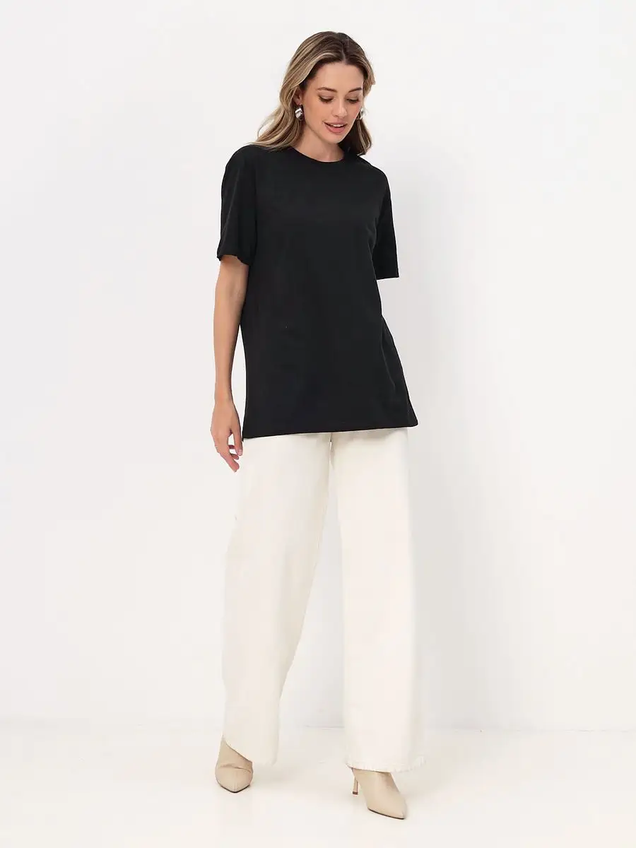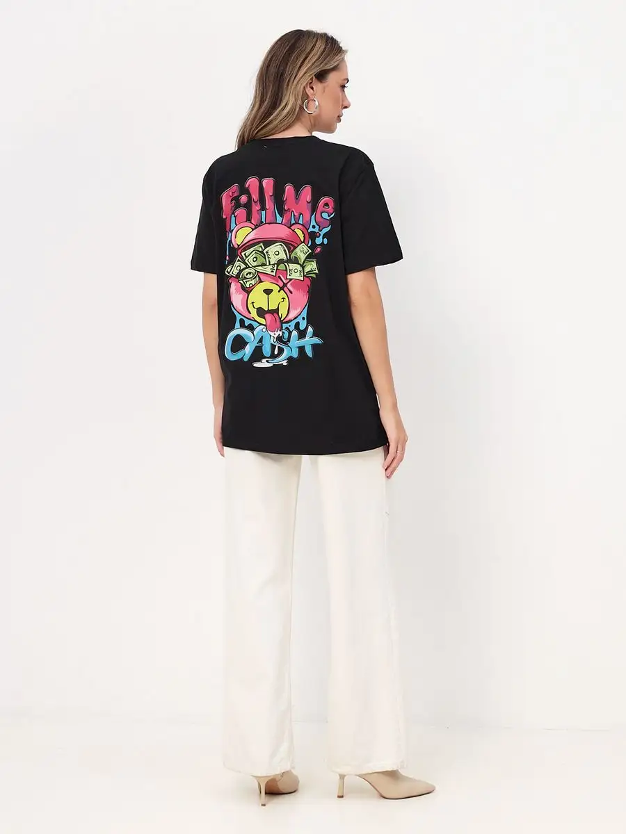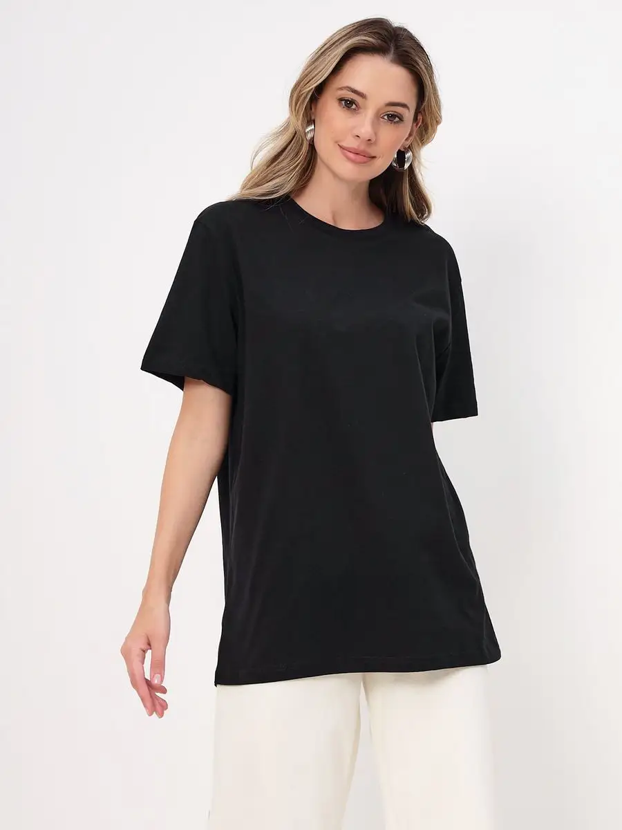 Черная футболка оверсайз с принтом на спине. Современная футболка оверсайз действительно имеет множество ярких вариантов как в покрое, так и в отделке. Богатые цветовые решения, материалы и актуальные тенденции сыграли не последнюю роль в моде на женские футболки. Собирая базовый сезонный гардероб, в любом женском стиле найдется место футболке женской. Черные футболки и топы можно смело носить не только весной и летом, включать в деловой образ и комбинировать с любой женской одеждой. В осенне-зимних комплектах футболка прекрасно сочетается с кардиганом, рубашкой или модным блейзером. Модные образы с оверсайз футболкой давно перестали ассоциироваться исключительно с повседневным спортивным стилем. Футболка оверсайз женская стала настолько универсальной, что сегодня трудно представить одежду женскую, с которой бы она не сочеталась вместе. Ведь даже утонченный бельевой стиль прекрасно смотрится в образах с базовой футболкой оверсайз. Базовая однотонная футболка оверсайз женская, как всегда, остается вне трендов. Классическая футболка актуальна, как и прежде, однако фасон таких футболок стал более свободным, ближе к тренду оверсайз. Очень модным стало носить футболку оверсайз с принтом, закатив рукава. Трендовая палитра оттенков футболок сезона 2023-2024 года больше напоминает радугу, так как актуальными будут не только яркие однотонные варианты. Как самая комфортная и универсальная женская одежда, модные футболки получили на этот раз больше оригинальных идей в дизайне с разными принтами и рисунками. Тренд носить футболку завязав подол в узел, наши футболки оверсайз универсальны для этого стиля. Таким образом, обычная футболка превращается в весьма стильный и модный предмет одежды, который поможет освежить повседневные аутфиты. Маст-хэвом нового сезона будут модные женские футболки с надписями.