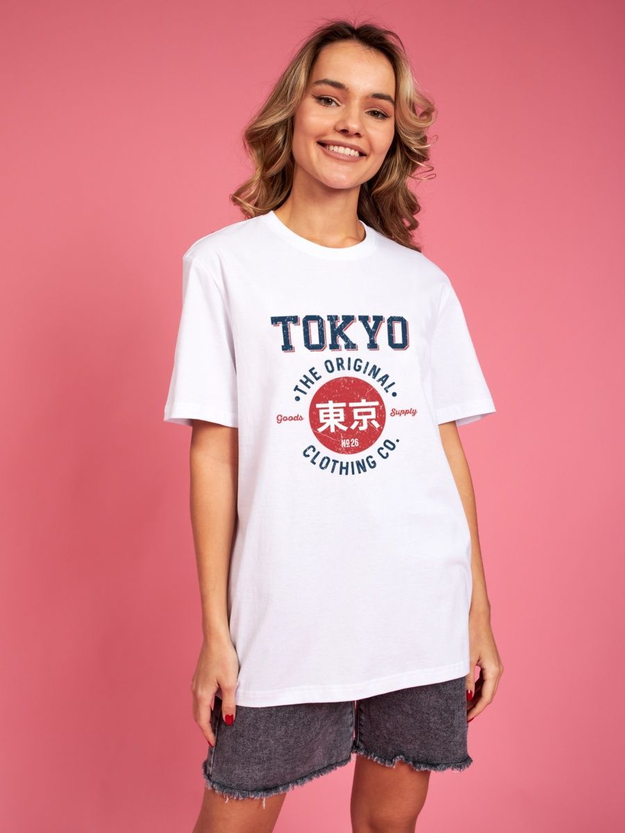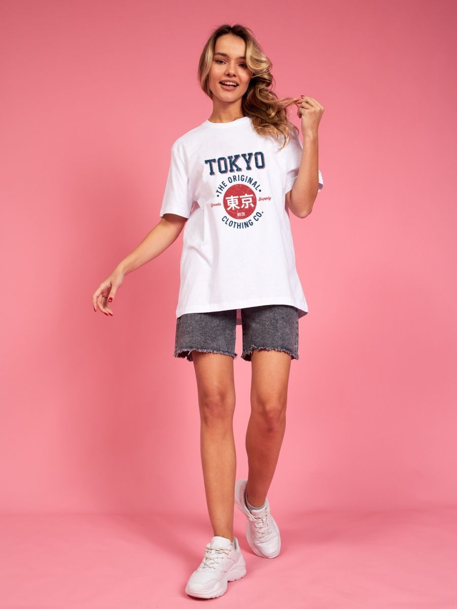 Мода в свободном стиле набирает обороты. В связи с этим наш бренд предлагает стильную футболку женскую оверсайз с принтом Tokyo (Токио) футболка Япокский стиль. Молодежная одежда в стиле oversize имеет свободный крой. Базовая модная футболка с округлой горловиной, которая держит форму и со временем не растянется. Повседневная майка свободного кроя с удлиненным рукавом и со спущенным плечом. Cостав – хлопок средней плотности, актуален в любое время года. Ткань слегка тянется, хорошо пропускает воздух, подходит для повседневной носки. Футболка уместна для дома, прогулок и спорта: фитнеса, гимнастики, йоги, бега, тренировок в зале и танцев. Она очень удобна для активного отдыха на природе, летом в качестве пляжной одежды для поездки на море, также можно сочетать с городским стилем. С помощью универсальной модели футболки oversize можно создать совершенно разные образы, скрыть недостатки фигуры и подчеркнуть достоинства. Этот крой оверсайз подойдет подросткам, девочкам и девушкам любого роста: высоким и низким. Беременные и кормящие женщины могут носить как платье-футболка. Футболка всё же разного размера, подойдет женщинам с размерами одежды от XS до XXXL. Свободная футболка - уместный подарок на праздник девушке, сестре, дочери, подруге, маме, любимой.