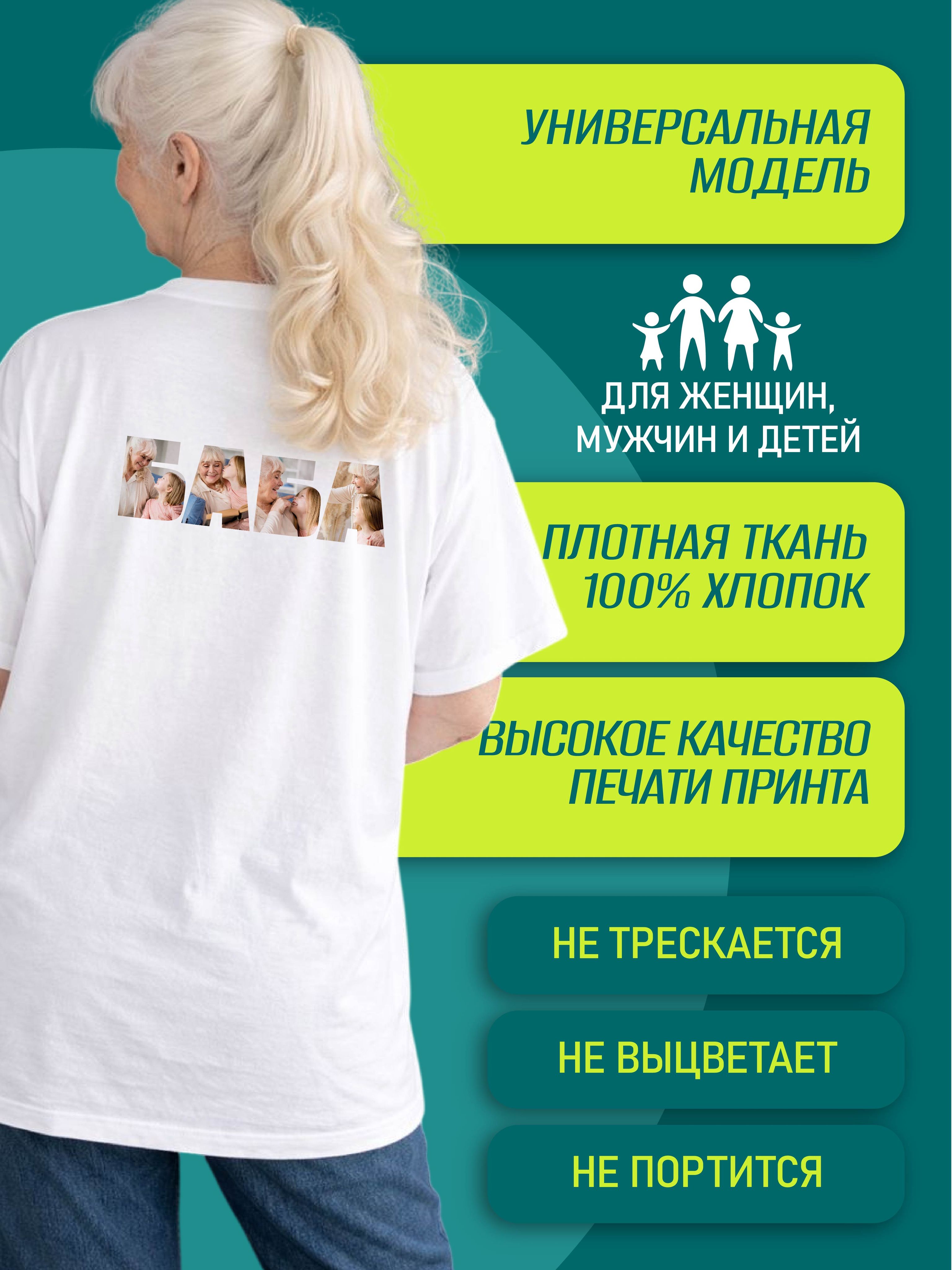 Белый баба / 48 / L / белый / 300 / Женский / свободный / #футболка_бабушка #футболка_бабе #лучшая_бабушка #подарок_бабушке #бабушка_с_фото #любимой_бабушке #футболка_для_бабушки #футболка_со_своим_принтом #футболка_с_фото #футболка_на_заказ #печать_на_заказ #бабушке_подарок #день_пожилого #подарок_бабушке_фото / Трикотаж / 100% хлопок / Деликатная стирка при 30 градусах, глажка с изнанки