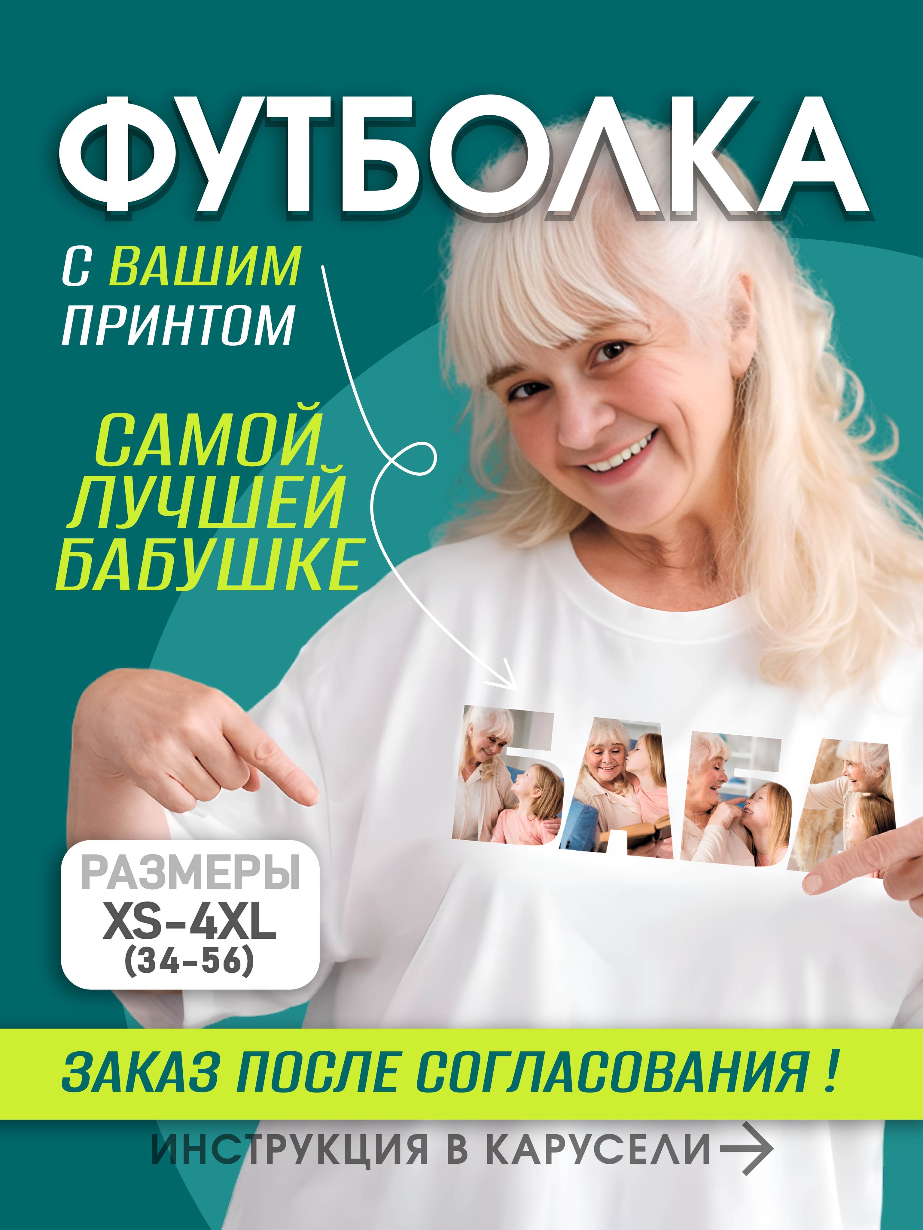 Белый баба / 50 / XL / белый / 300 / Женский / свободный / #футболка_бабушка #футболка_бабе #лучшая_бабушка #подарок_бабушке #бабушка_с_фото #любимой_бабушке #футболка_для_бабушки #футболка_со_своим_принтом #футболка_с_фото #футболка_на_заказ #печать_на_заказ #бабушке_подарок #день_пожилого #подарок_бабушке_фото / Трикотаж / 100% хлопок / Деликатная стирка при 30 градусах, глажка с изнанки