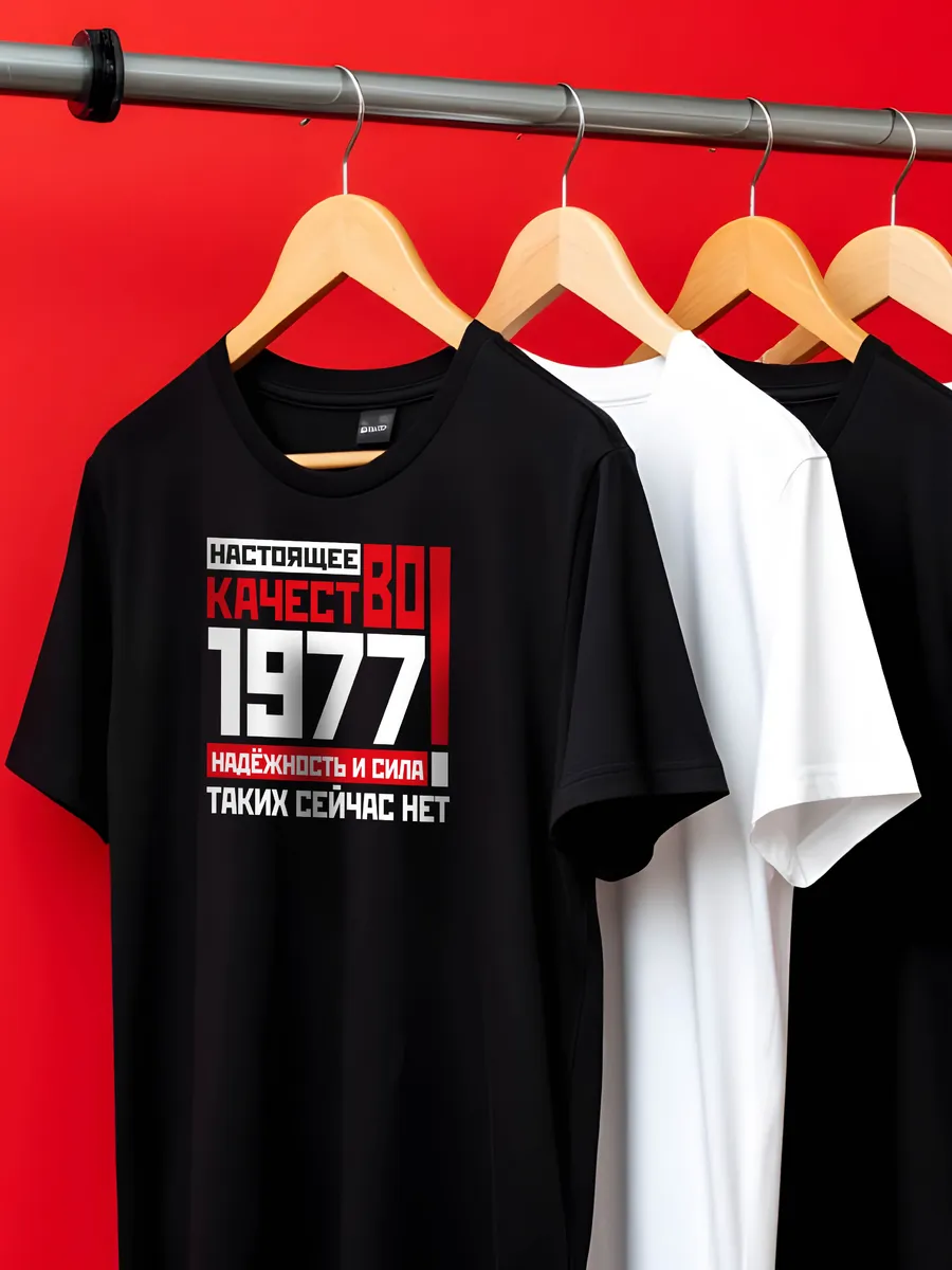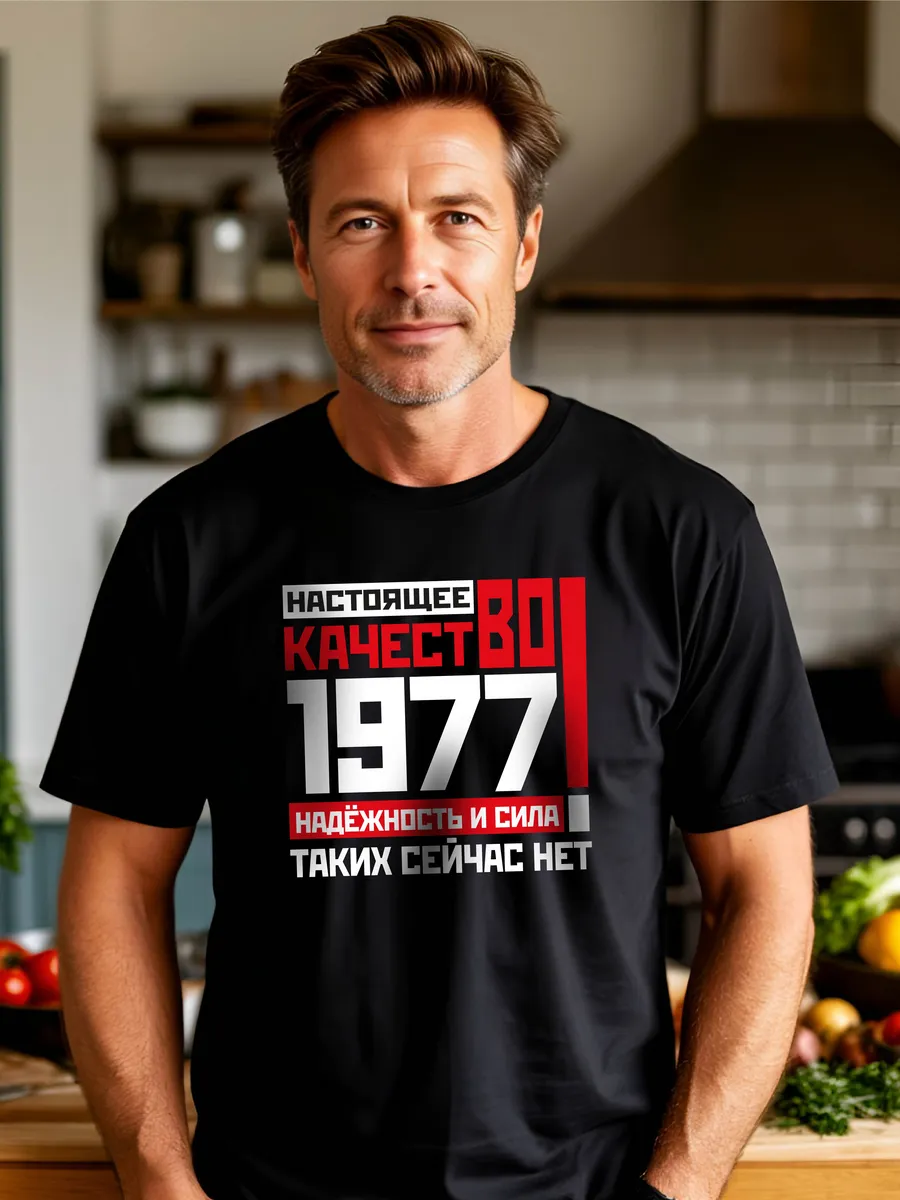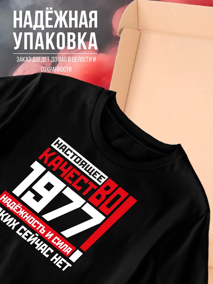 Что подарить мужчине отцу мужу дедушке папе на день рождения? Крутой модный стильный подарок - футболка со смешным принтом прикол год рождения 1977. Это базовая хлопковая свободная футболка с рисунком и оригинальной надписью.