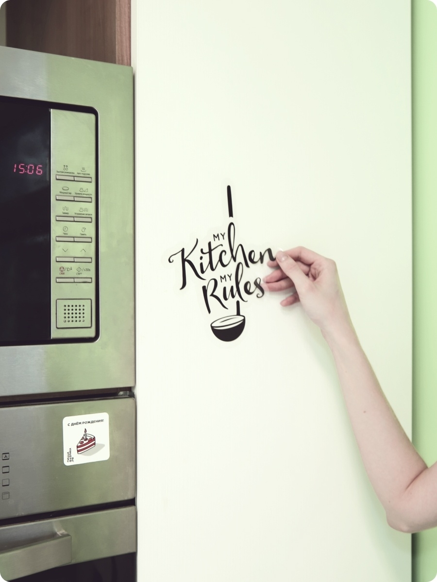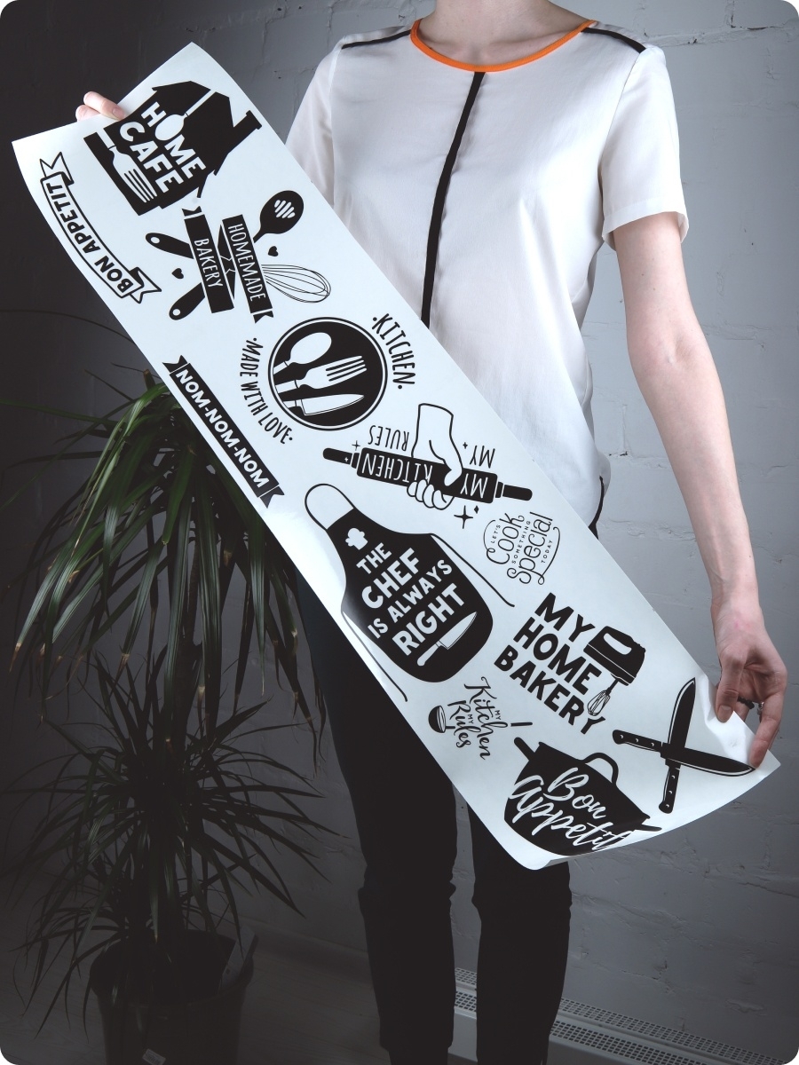 Интерьерные наклейки для кухни напечатаны экологичными чернилами без запаха на прозрачной виниловой плёнке. Стикеры точно вырезаны по контуру, легко клеятся и снимаются без следов с гладких поверхностей. Идеально подходят для украшения кухонного фартука, холодильника, стен или шкафов, создавая стильный и уютный акцент в интерьере.