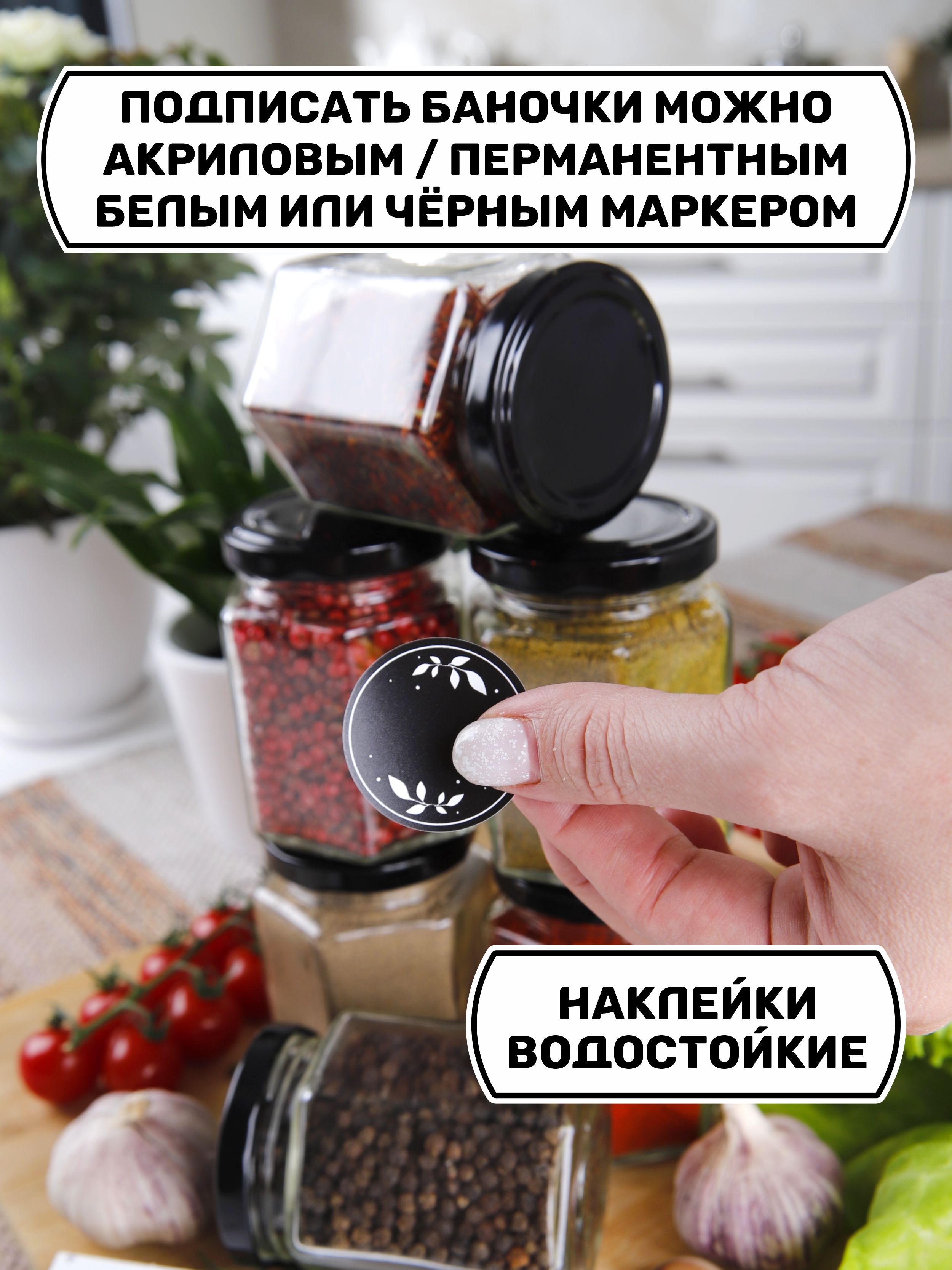 3 баночки, 3 черные крышки, белые и чёрные наклейки для подписей