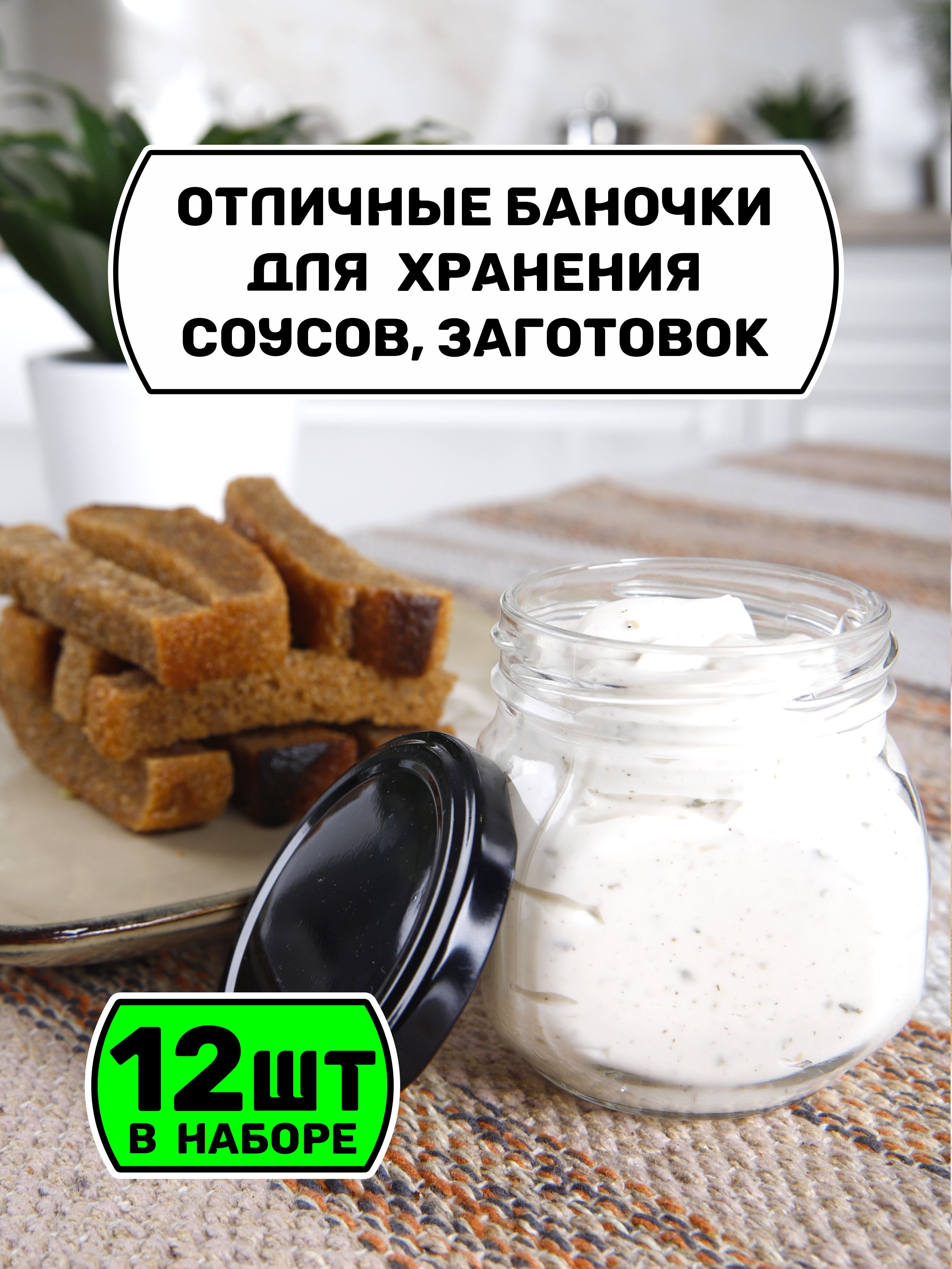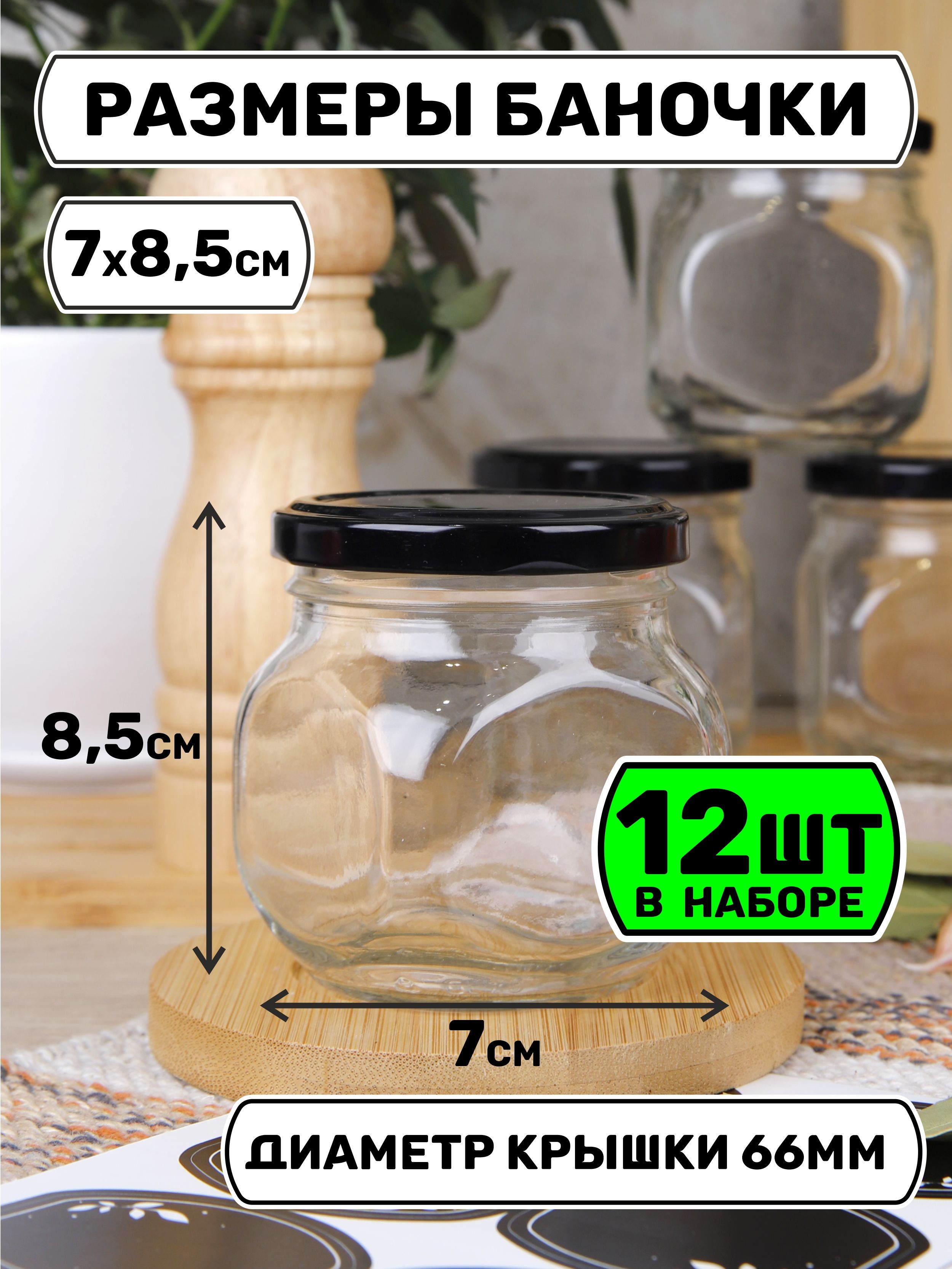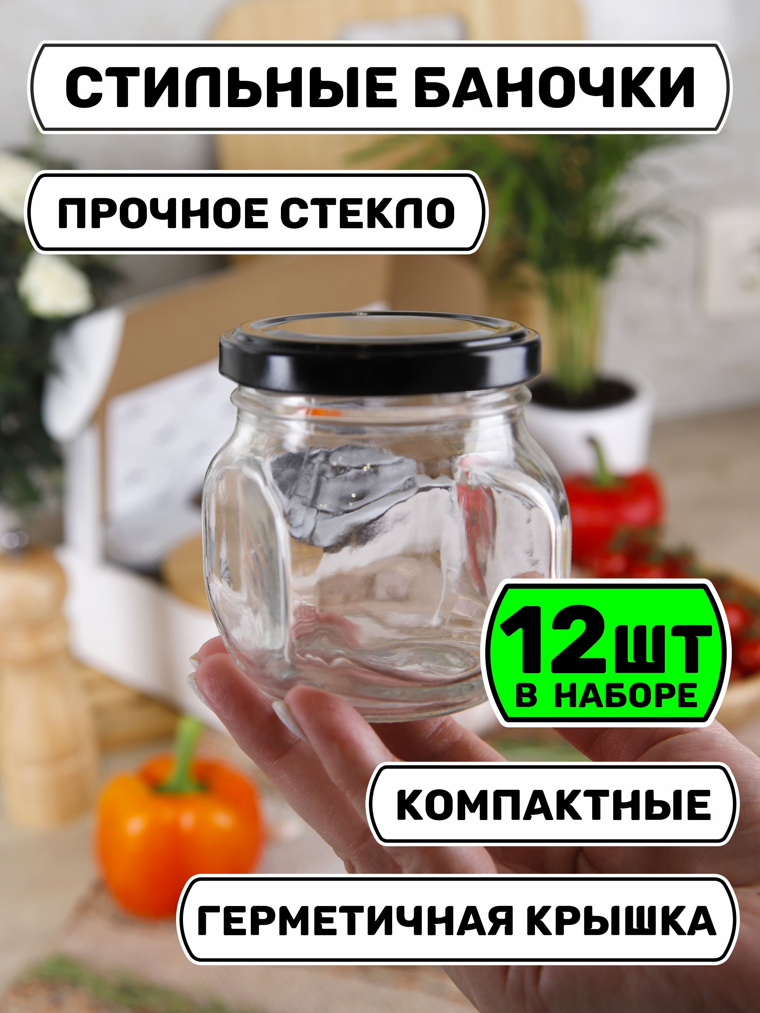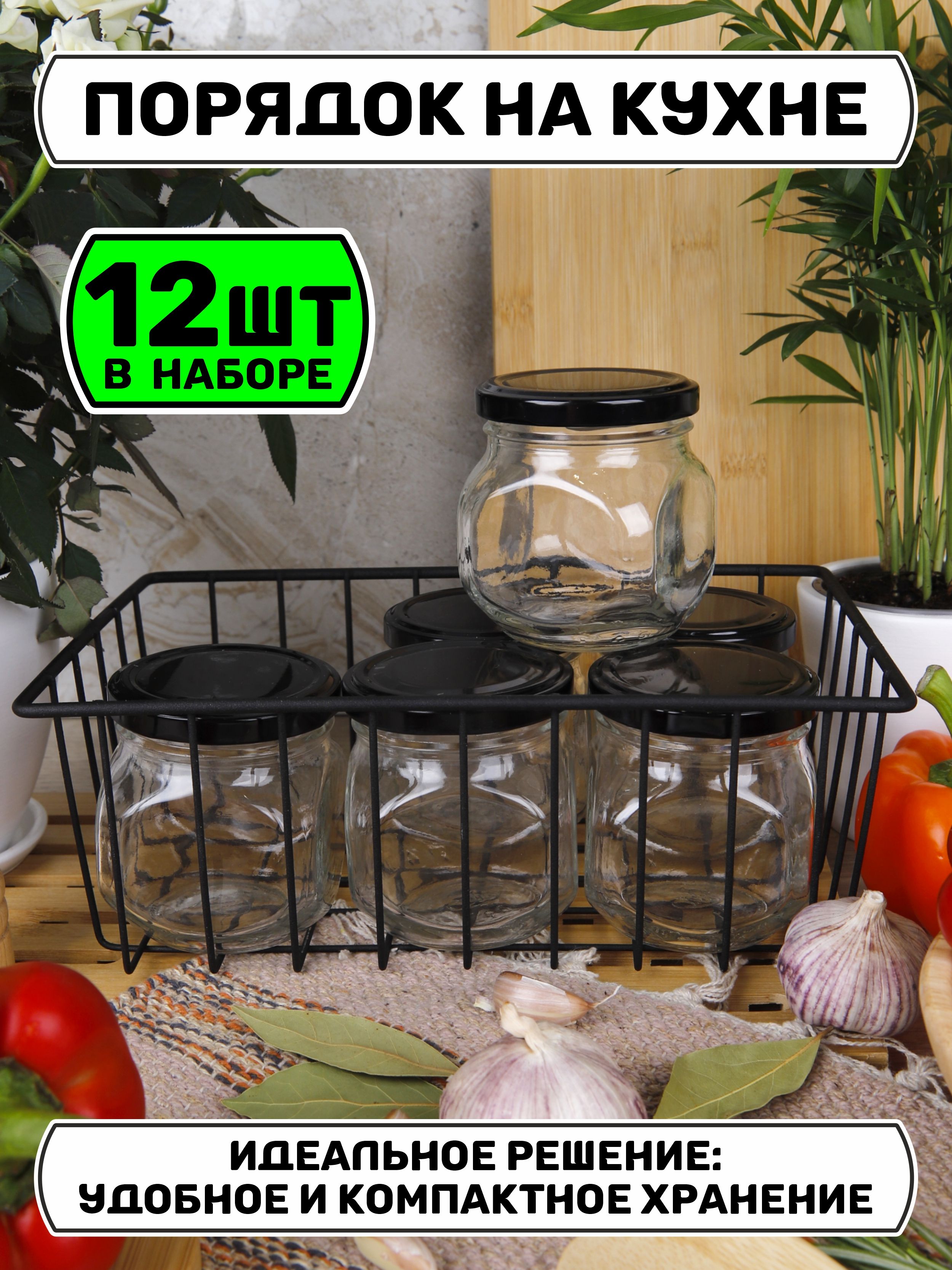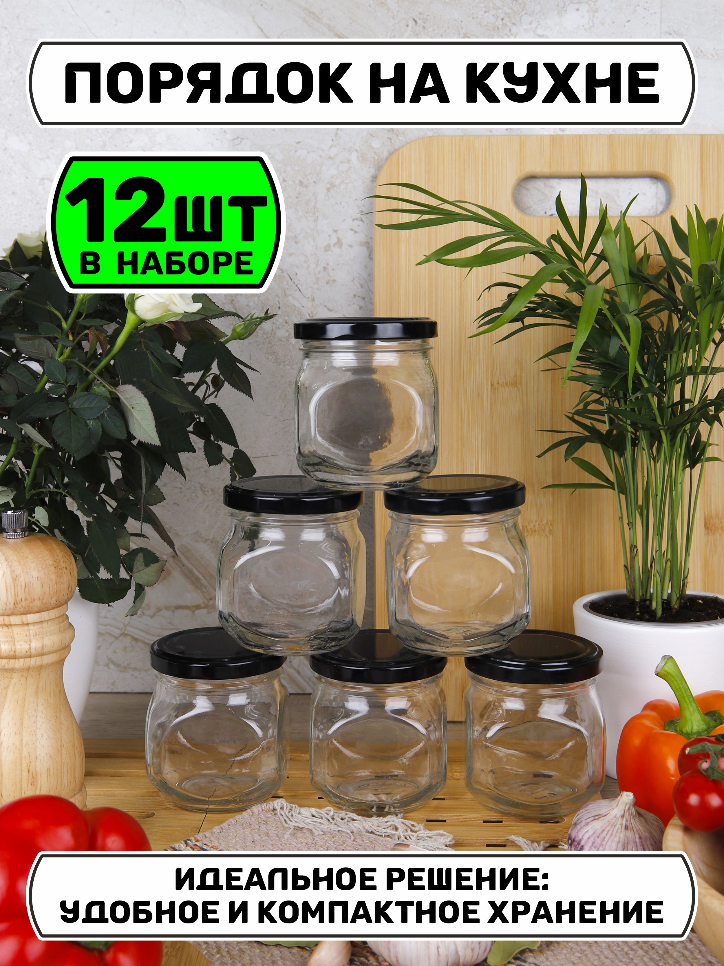 Банки для хранения 200 мл., 12 шт., черные крышечки
