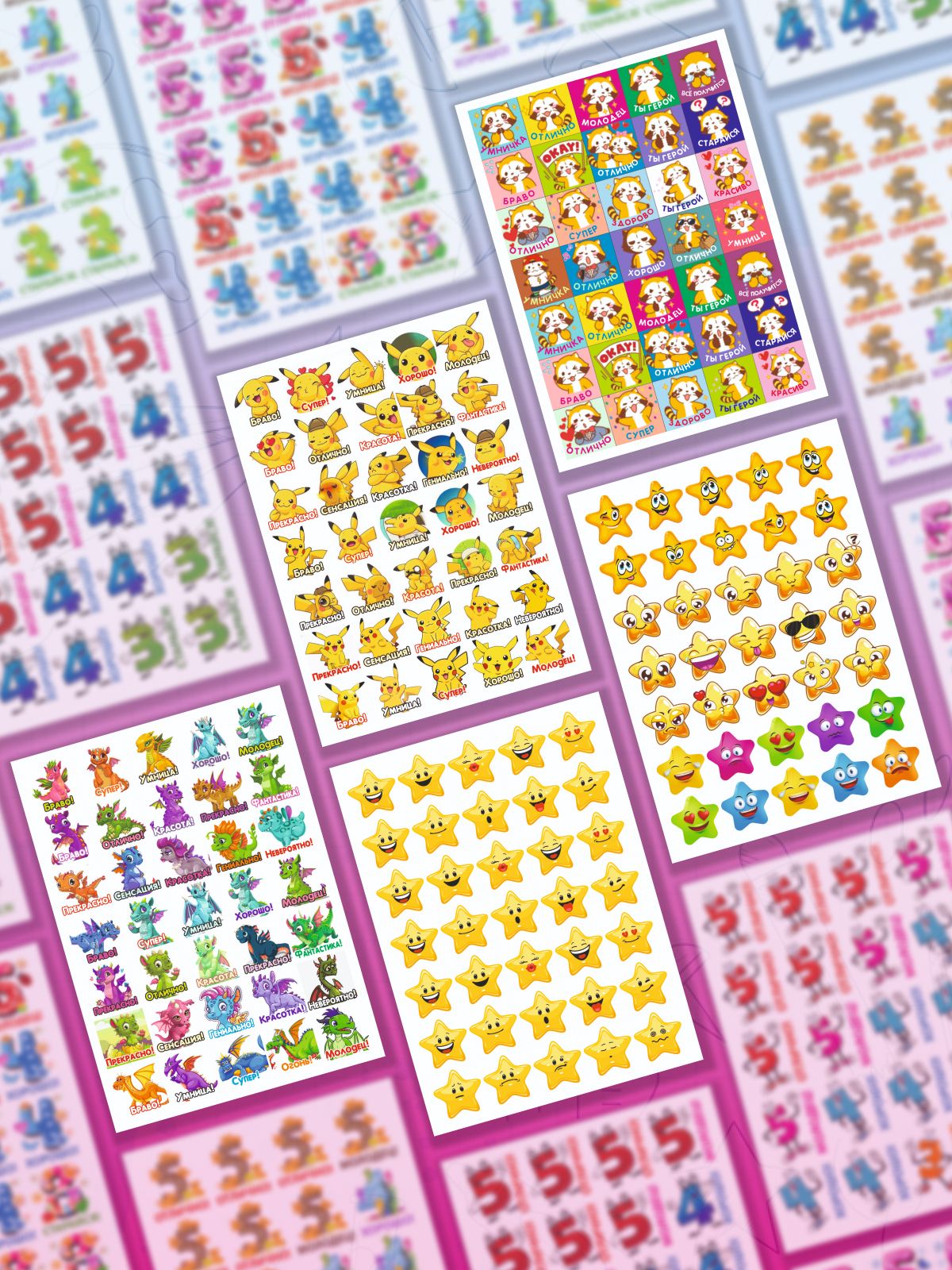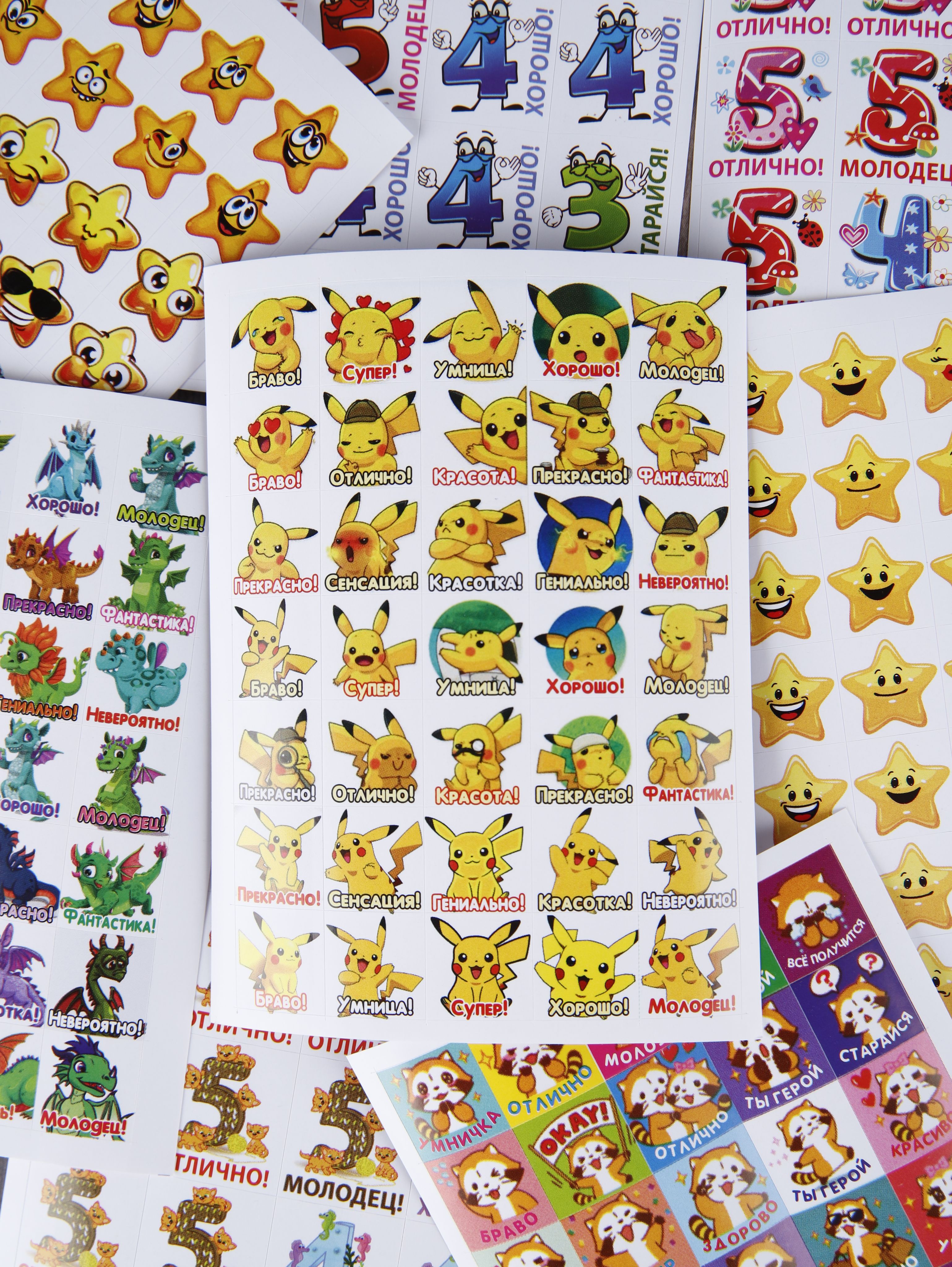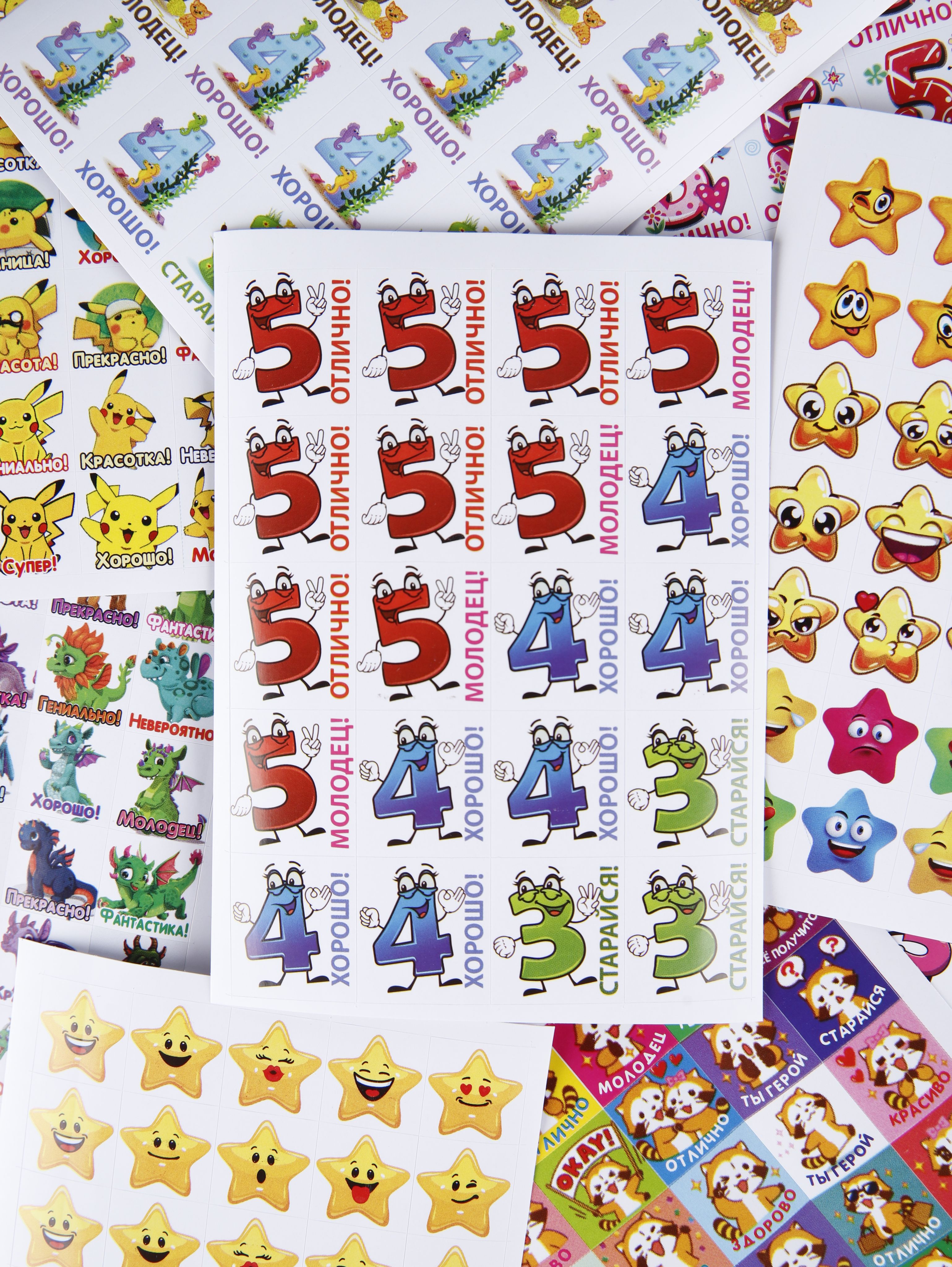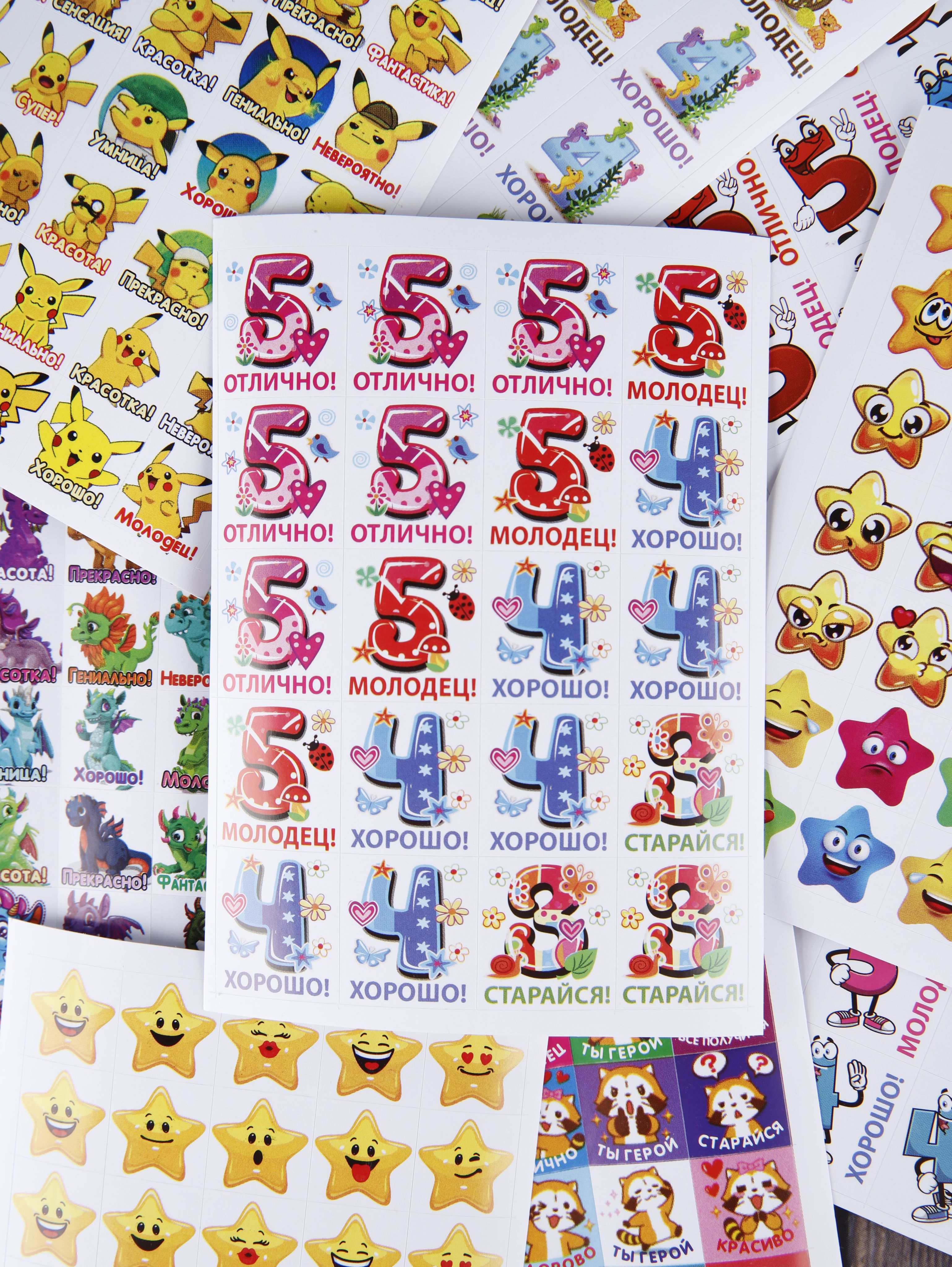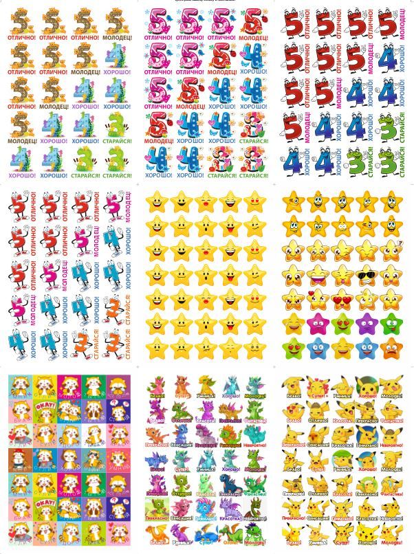 Наклейки оценки и стикеры оценки ( поощрительные наклейки ) - это удобный способ поощрения для мальчиков и девочек первоклассников и детей в саду. Оценочные наклейки будут незаменимыми помощниками для учителей начальных классов и воспитателей детского сада, подготовительных курсов. Наклейки изготовлены из самоклеющейся бумаги, вырезаны по контуру, легко снимаются с подложки и надежно крепятся на любой гладкой, чистой поверхности. Мотивирующие наклейки в наборе на 12 листах. В набор входит комплект стикеров оценки от 300 до 420 поощрительных наклеек. Набор упакован в прозрачный пакет, что предотвращает загрязнение при транспортировке. Стикеры оценки изготовлены современной цифровой печатью, вырезаны по контуру, изображение на поощрительных наклейках не смывается, стойкое к выцветанию, не имеет посторонних запахов.Мы надеемся, что с таким набором наклеек оценки обучение будет ярким и интересным!