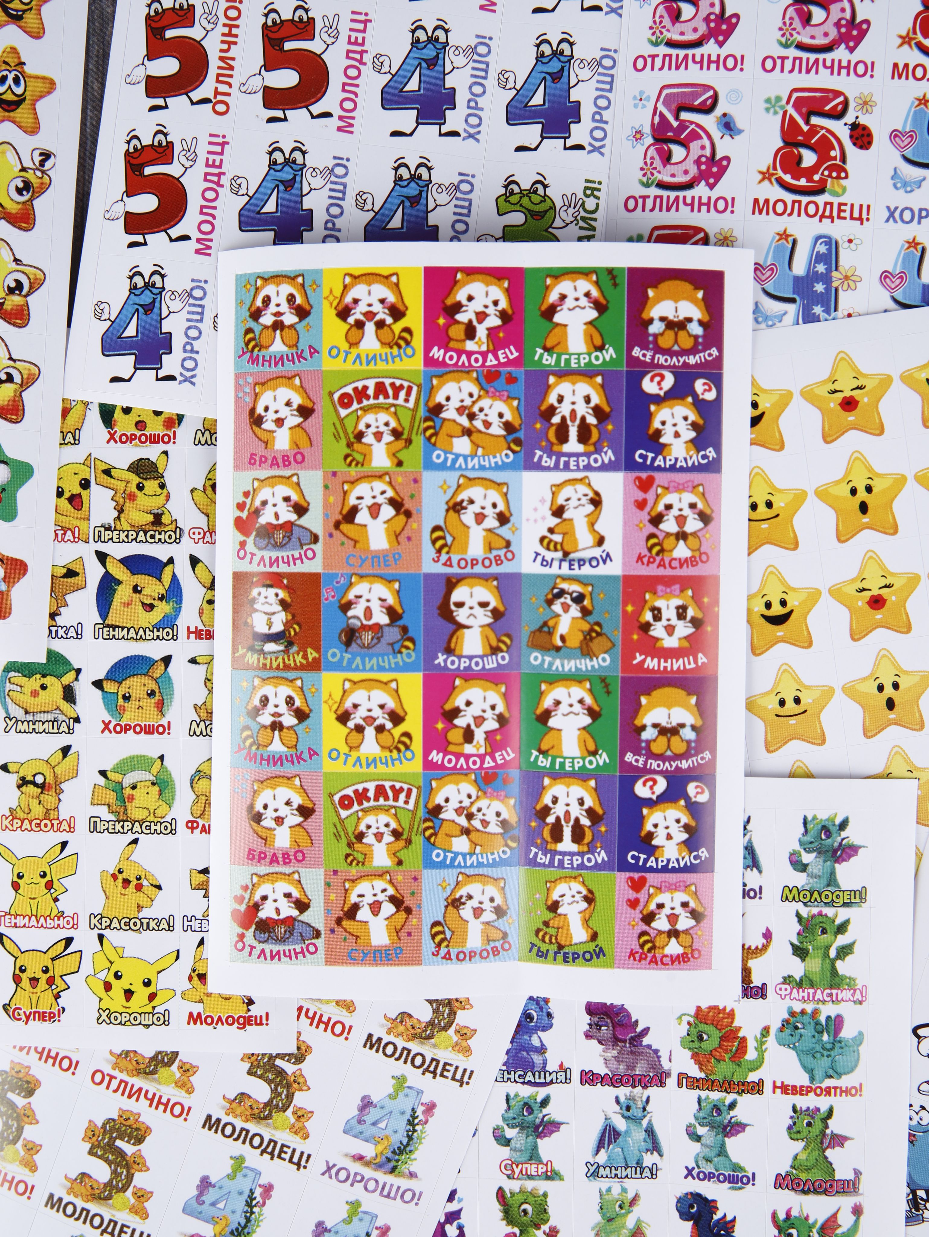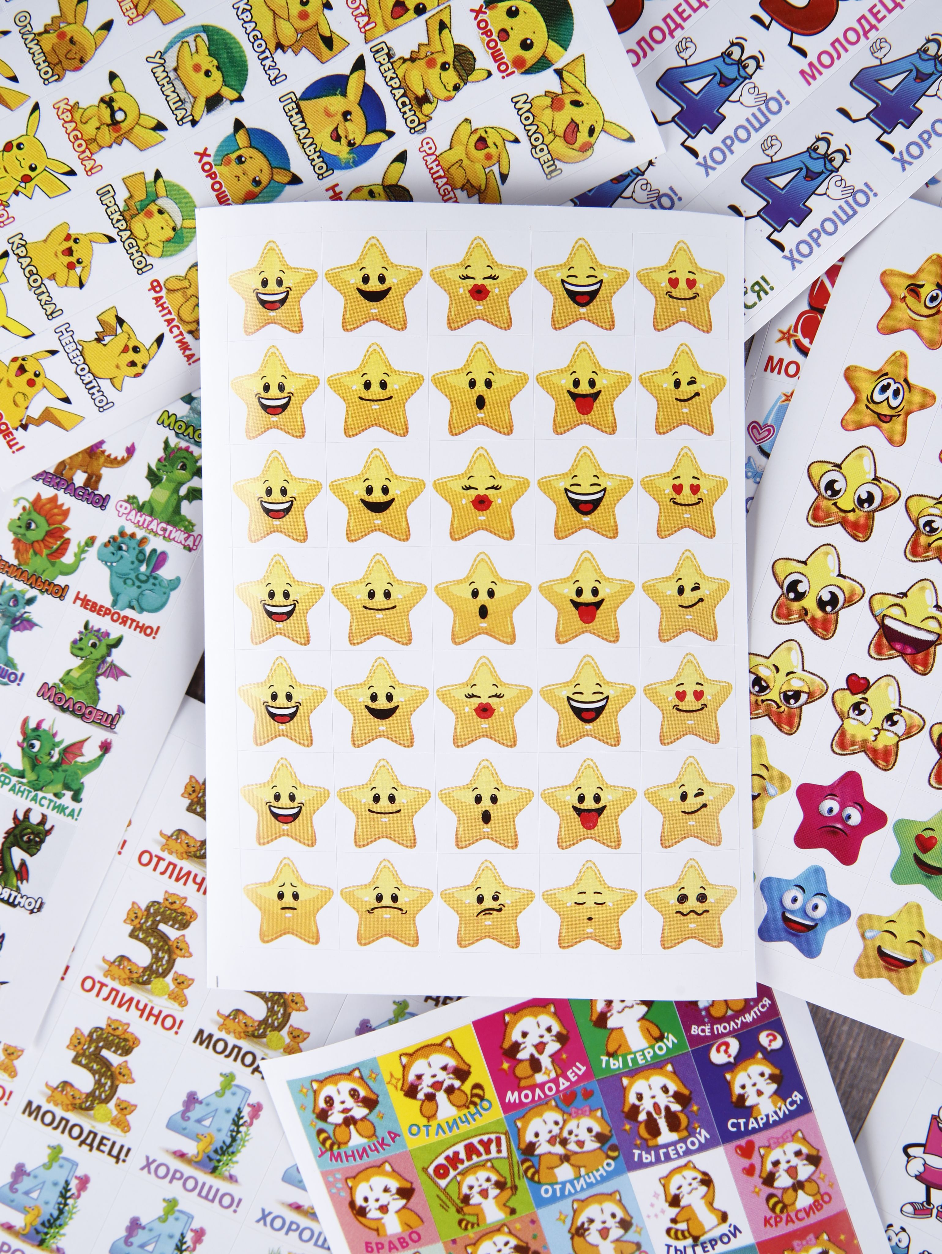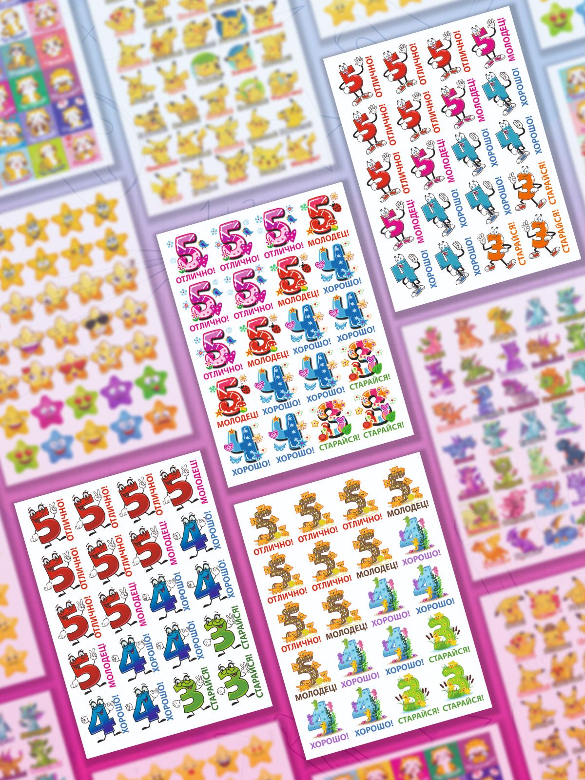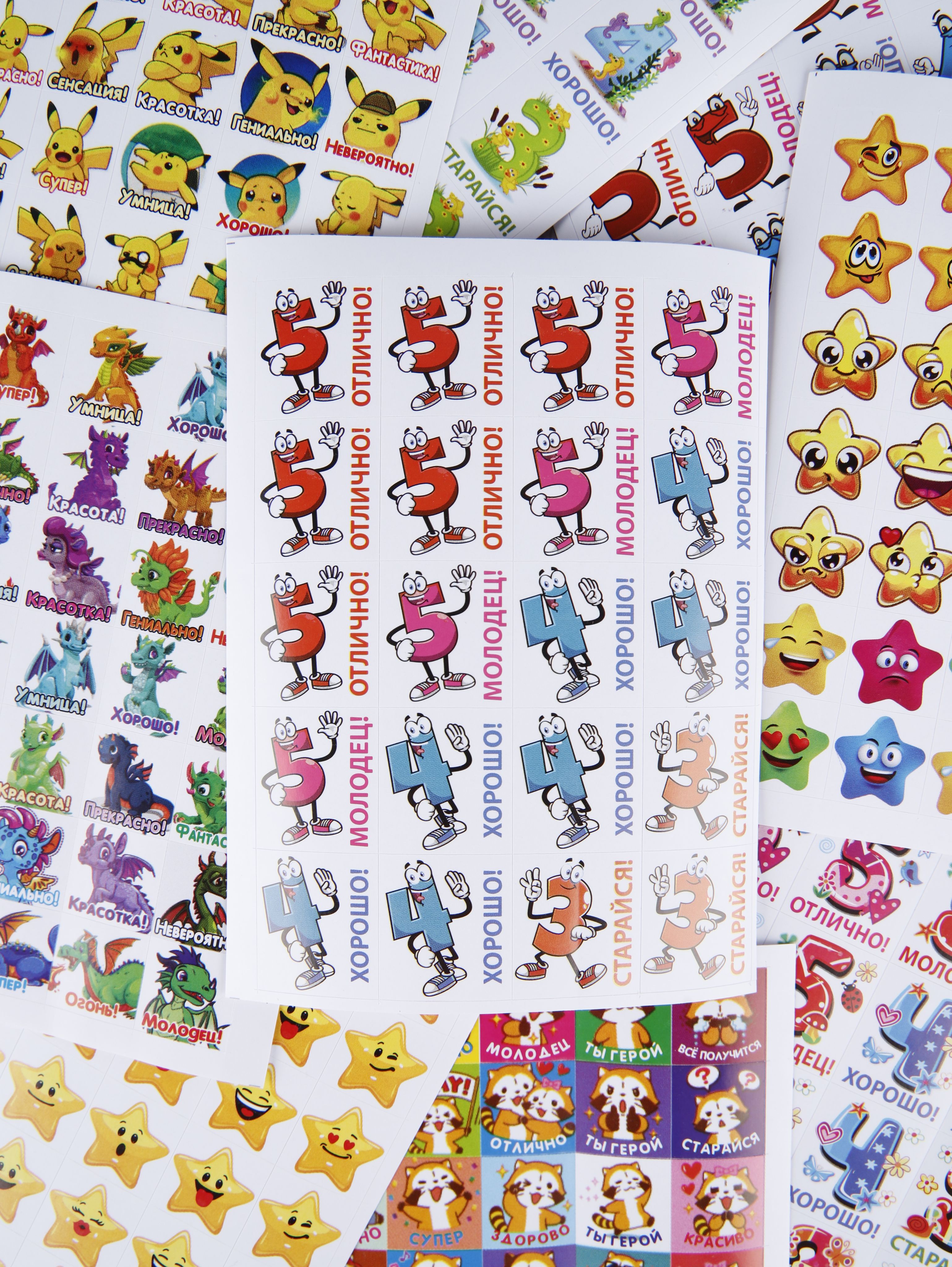 Наклейки оценки и стикеры оценки ( поощрительные наклейки ) - это удобный способ поощрения для мальчиков и девочек первоклассников и детей в саду. Оценочные наклейки будут незаменимыми помощниками для учителей начальных классов и воспитателей детского сада, подготовительных курсов. Наклейки изготовлены из самоклеющейся бумаги, вырезаны по контуру, легко снимаются с подложки и надежно крепятся на любой гладкой, чистой поверхности. Мотивирующие наклейки в наборе на 12 листах. В набор входит комплект стикеров оценки от 300 до 420 поощрительных наклеек. Набор упакован в прозрачный пакет, что предотвращает загрязнение при транспортировке. Стикеры оценки изготовлены современной цифровой печатью, вырезаны по контуру, изображение на поощрительных наклейках не смывается, стойкое к выцветанию, не имеет посторонних запахов.Мы надеемся, что с таким набором наклеек оценки обучение будет ярким и интересным!