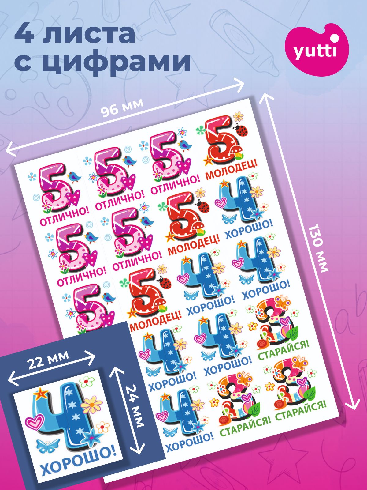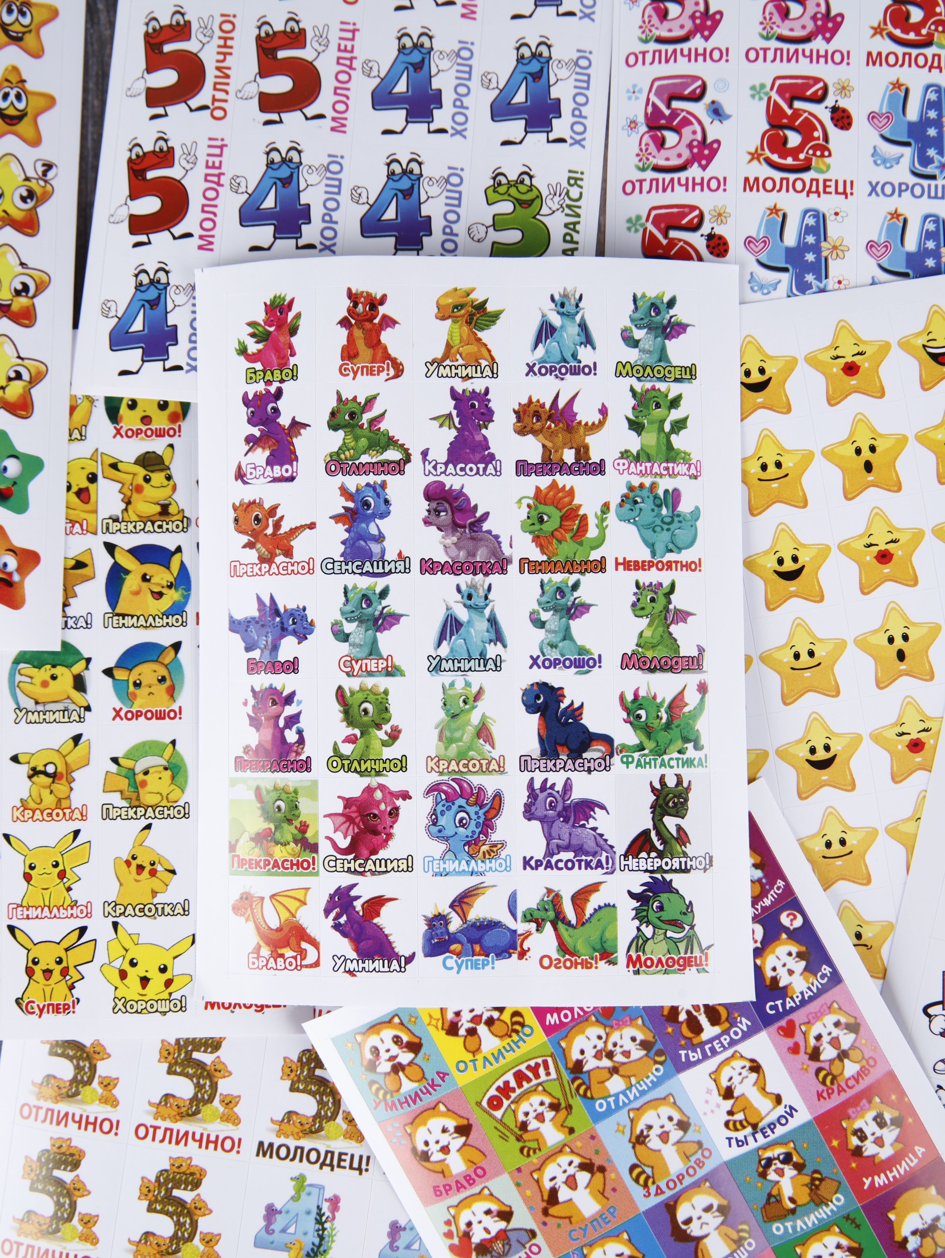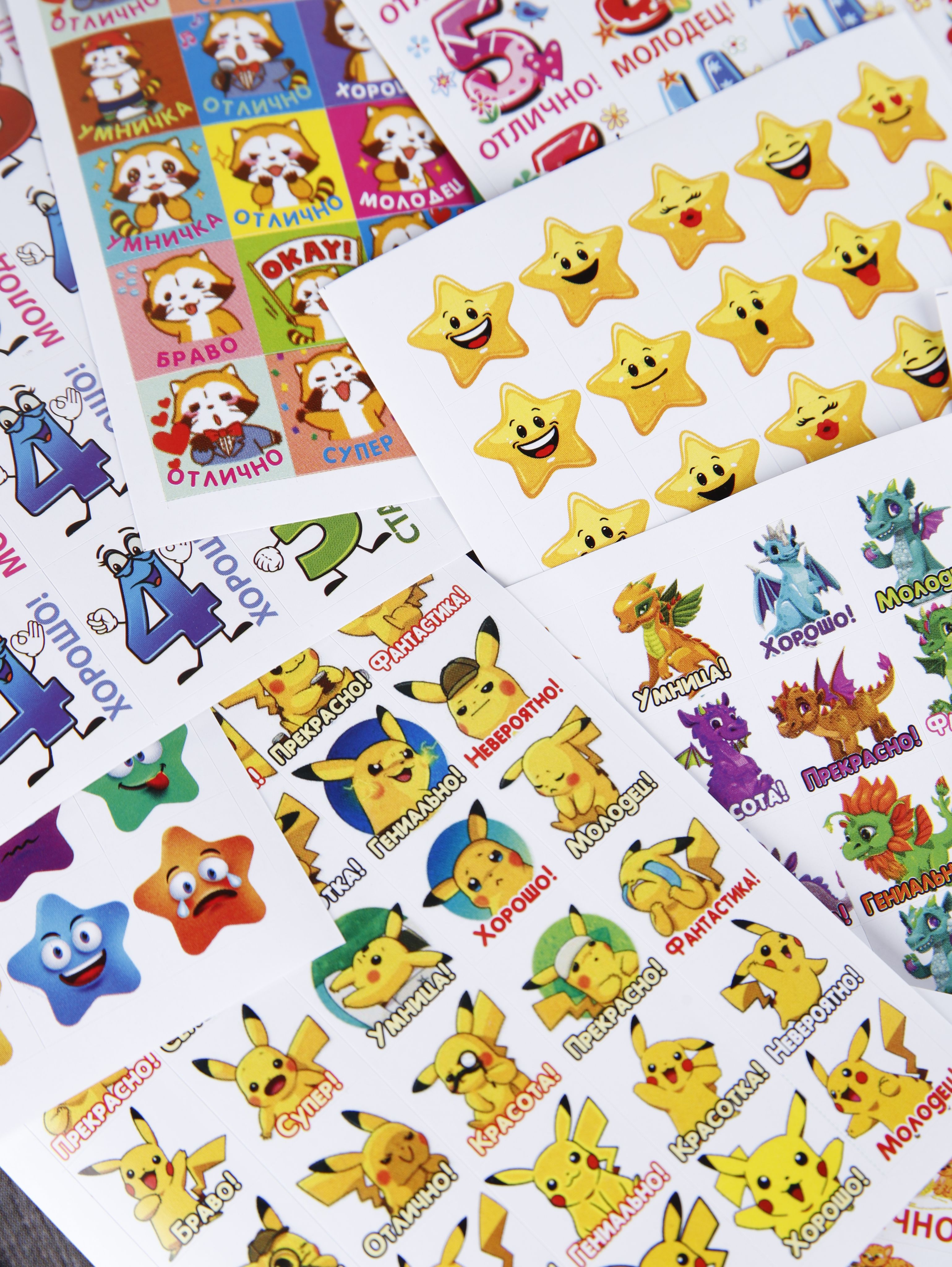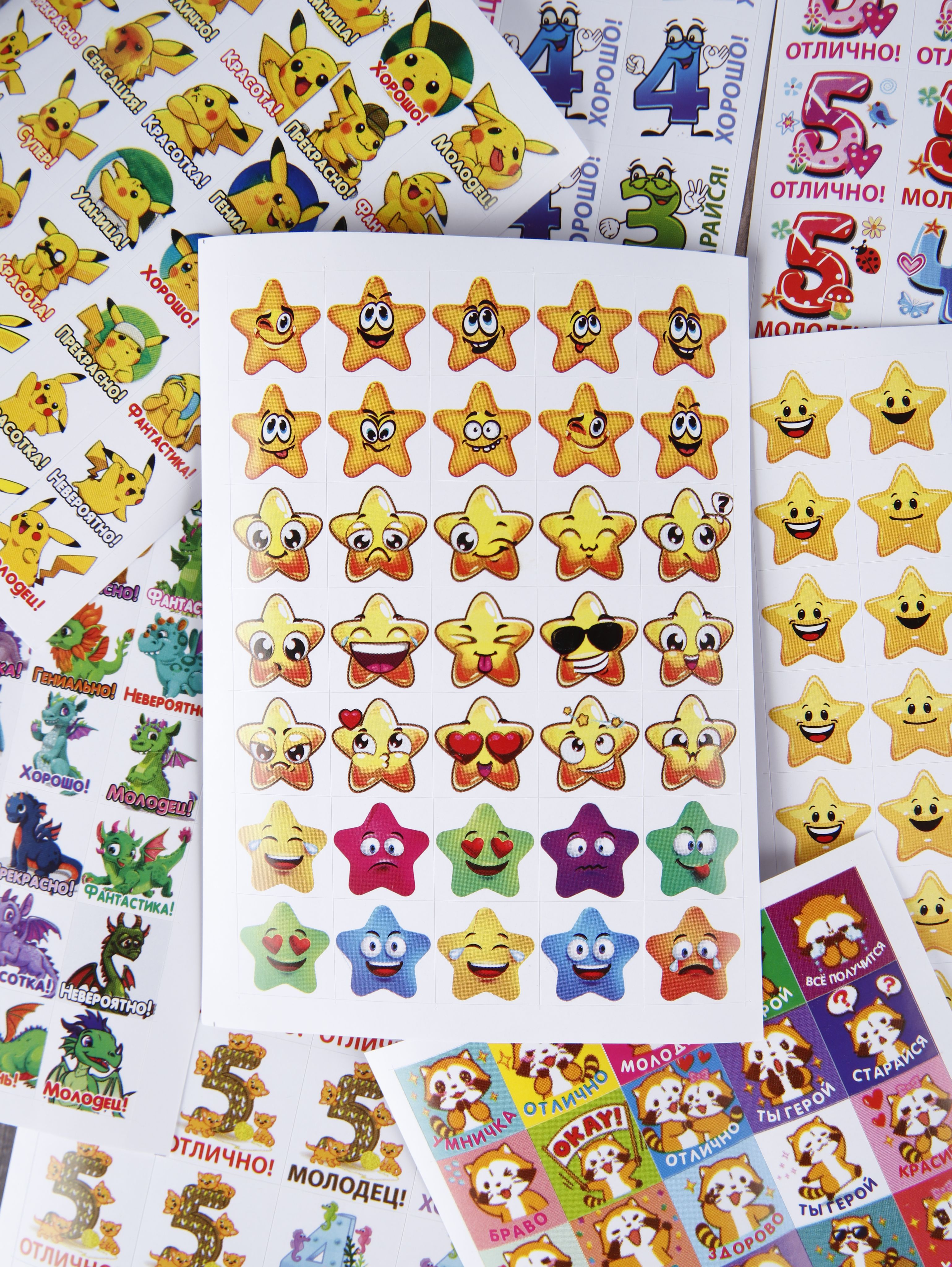 Наклейки оценки и стикеры оценки ( поощрительные наклейки ) - это удобный способ поощрения для мальчиков и девочек первоклассников и детей в саду. Оценочные наклейки будут незаменимыми помощниками для учителей начальных классов и воспитателей детского сада, подготовительных курсов. Наклейки изготовлены из самоклеющейся бумаги, вырезаны по контуру, легко снимаются с подложки и надежно крепятся на любой гладкой, чистой поверхности. Мотивирующие наклейки в наборе на 12 листах. В набор входит комплект стикеров оценки от 300 до 420 поощрительных наклеек. Набор упакован в прозрачный пакет, что предотвращает загрязнение при транспортировке. Стикеры оценки изготовлены современной цифровой печатью, вырезаны по контуру, изображение на поощрительных наклейках не смывается, стойкое к выцветанию, не имеет посторонних запахов.Мы надеемся, что с таким набором наклеек оценки обучение будет ярким и интересным!